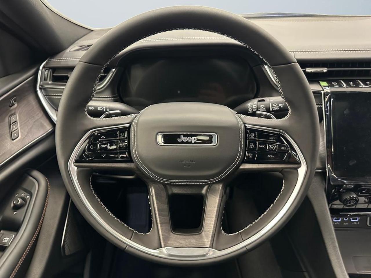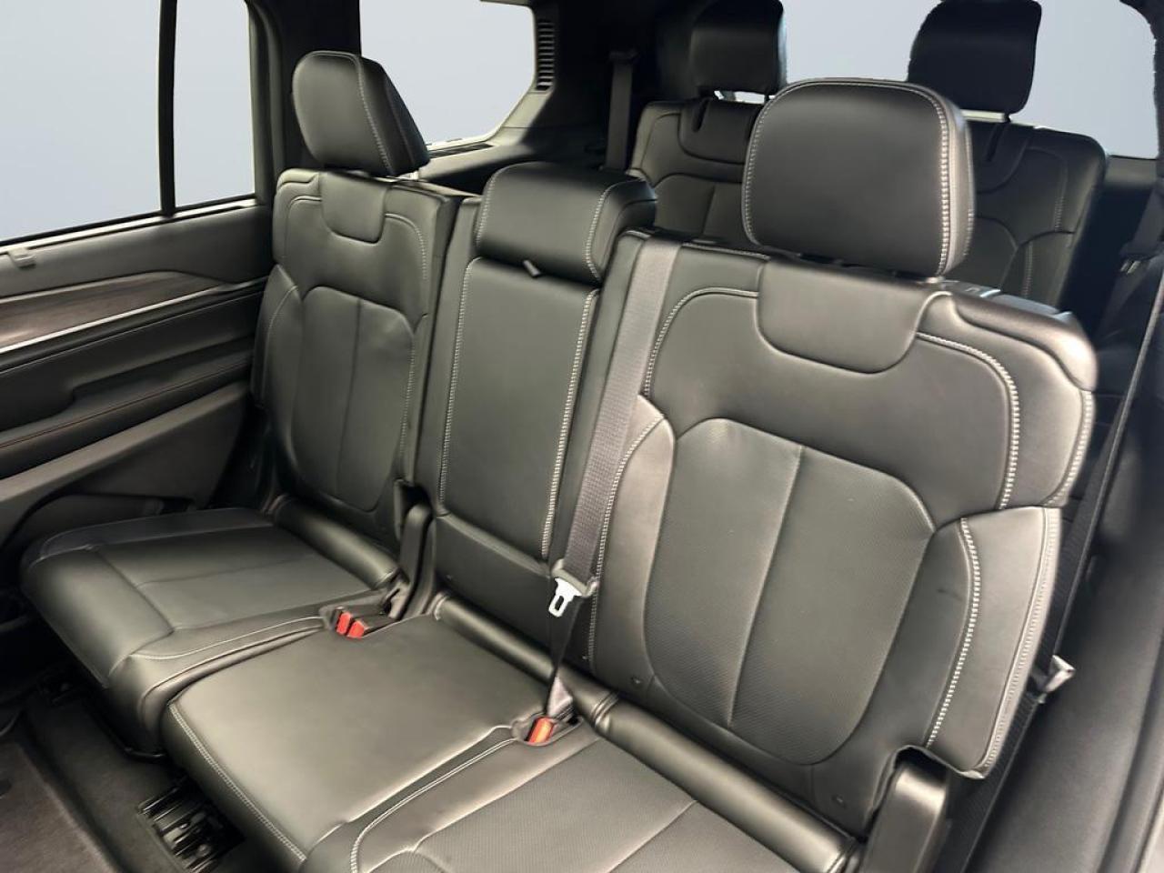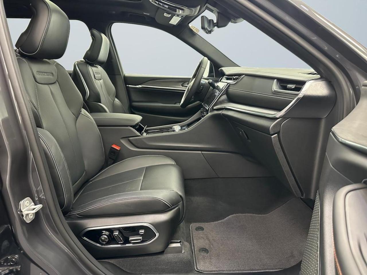 Inside, the Overland offers a refined cabin with Nappa leather-faced seating, front heated and ventilated seats, second-row heated seats, and a heated steering wheel. The dual-pane CommandView panoramic sunroof, multi-color ambient lighting, and active noise control enhance the premium driving experience. This model includes the Luxury Tech Group IV, adding 12-way power front seats with massage, passenger seat memory, wireless charging, second-row window shades, and an auto-dimming digital rearview mirror. A 10.25-inch digital cluster pairs with Uconnect 5 NAV and a 10.1-inch touchscreen featuring SiriusXM 360L and full smartphone connectivity.