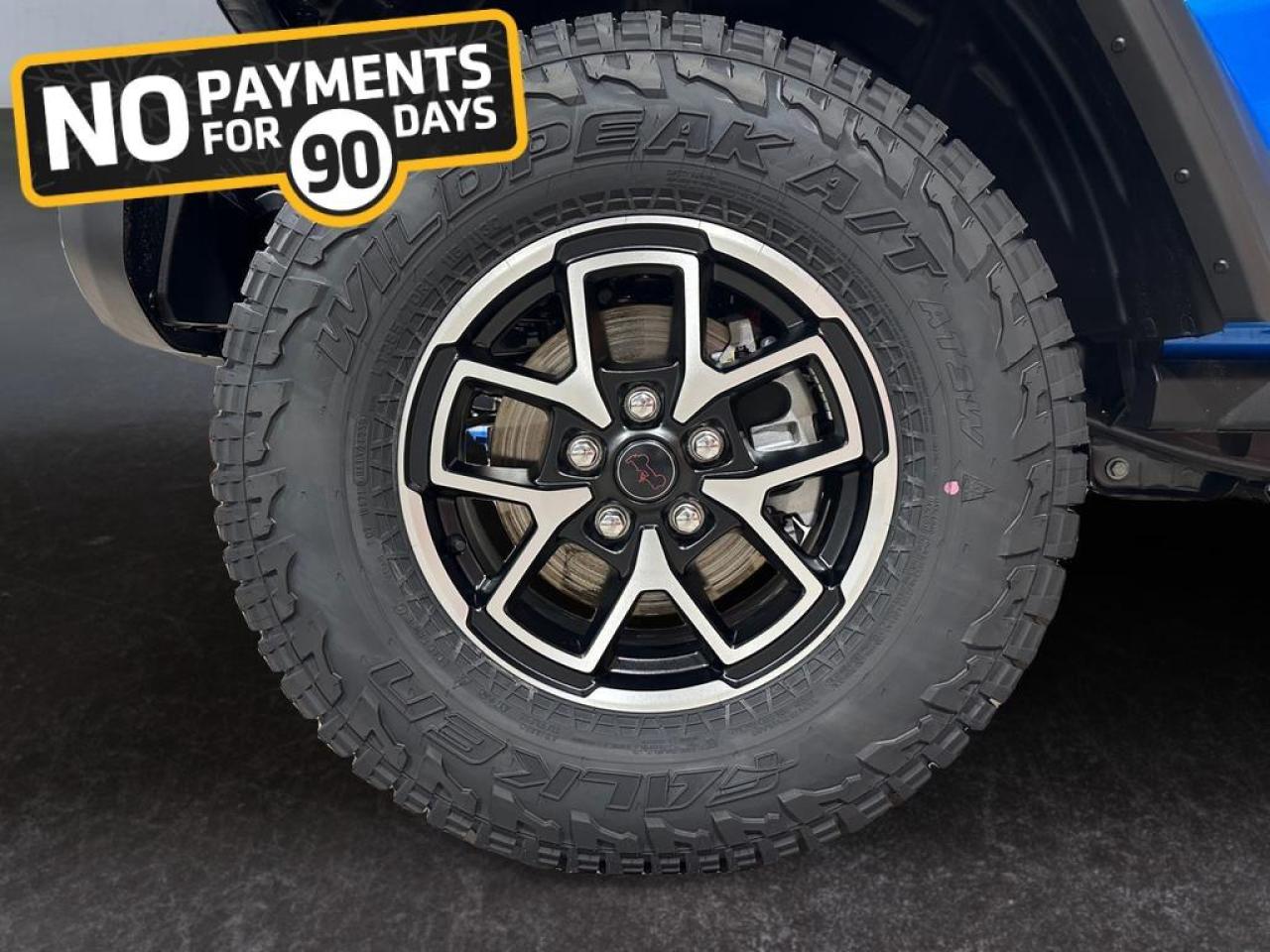 The Rubicon rides on 33" all-terrain LT285/70R17 tires with heavy-duty Dana 44 axles, 4.10 axle ratio, skid plates, rock rails, tow hooks, and high?clearance fender flares built for extreme off-road performance.