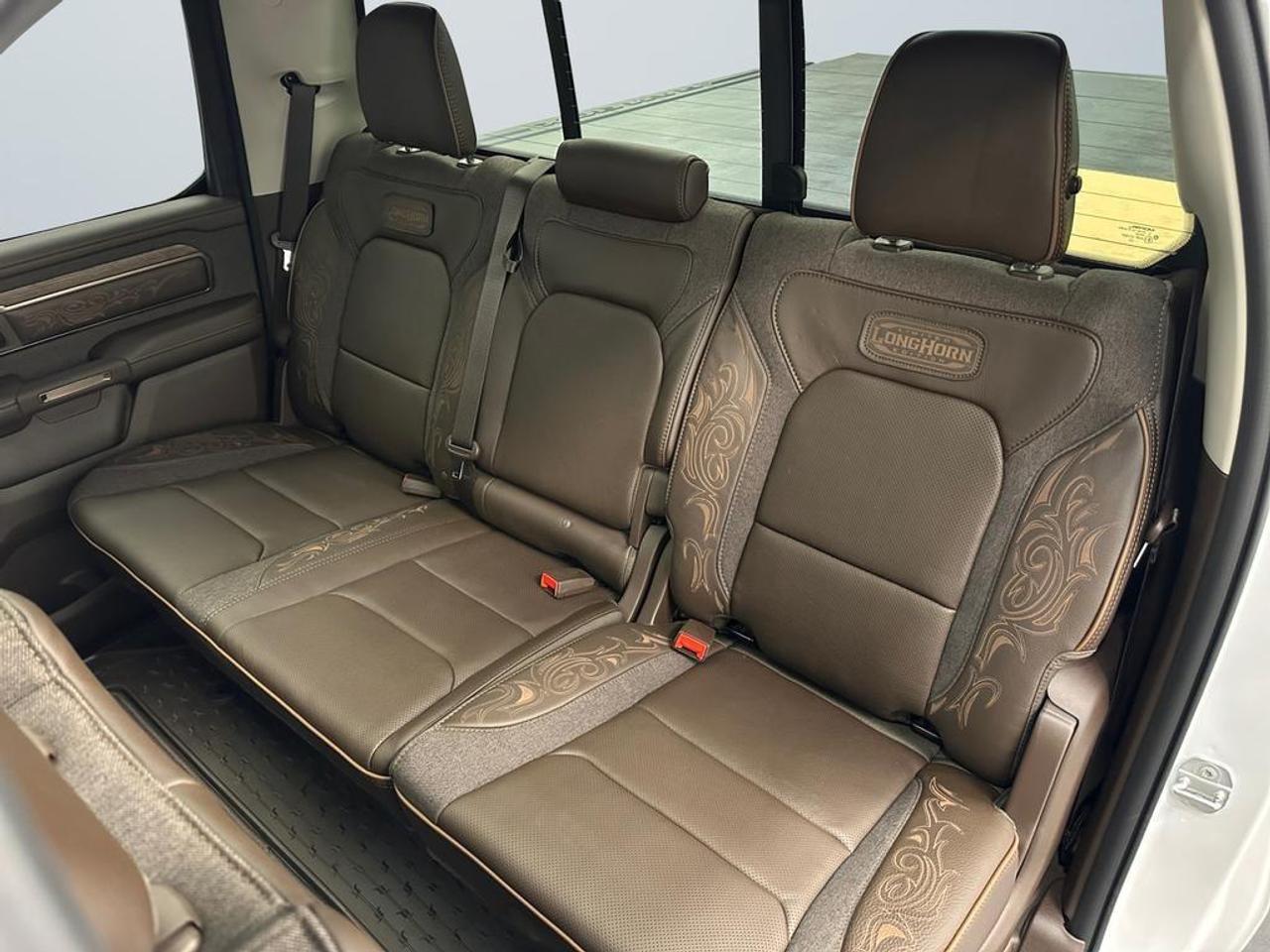 Safety and driver assistance are advanced with Adaptive Cruise Control with Stop & Go, Blind Spot & Cross Path Detection, Active Lane Management, Full-Speed Forward Collision Warning, Pedestrian Emergency Braking, Intersection Collision Assist, Traffic Sign Recognition, Evasive Steering Assist, and ParkSense Front/Rear Park Assist. Exterior highlights include LED lighting, chrome grille and Longhorn badges, power-deployable running boards, dual rear exhaust with bright tips, body-color bumpers, and exterior mirrors with memory and approach lamps.