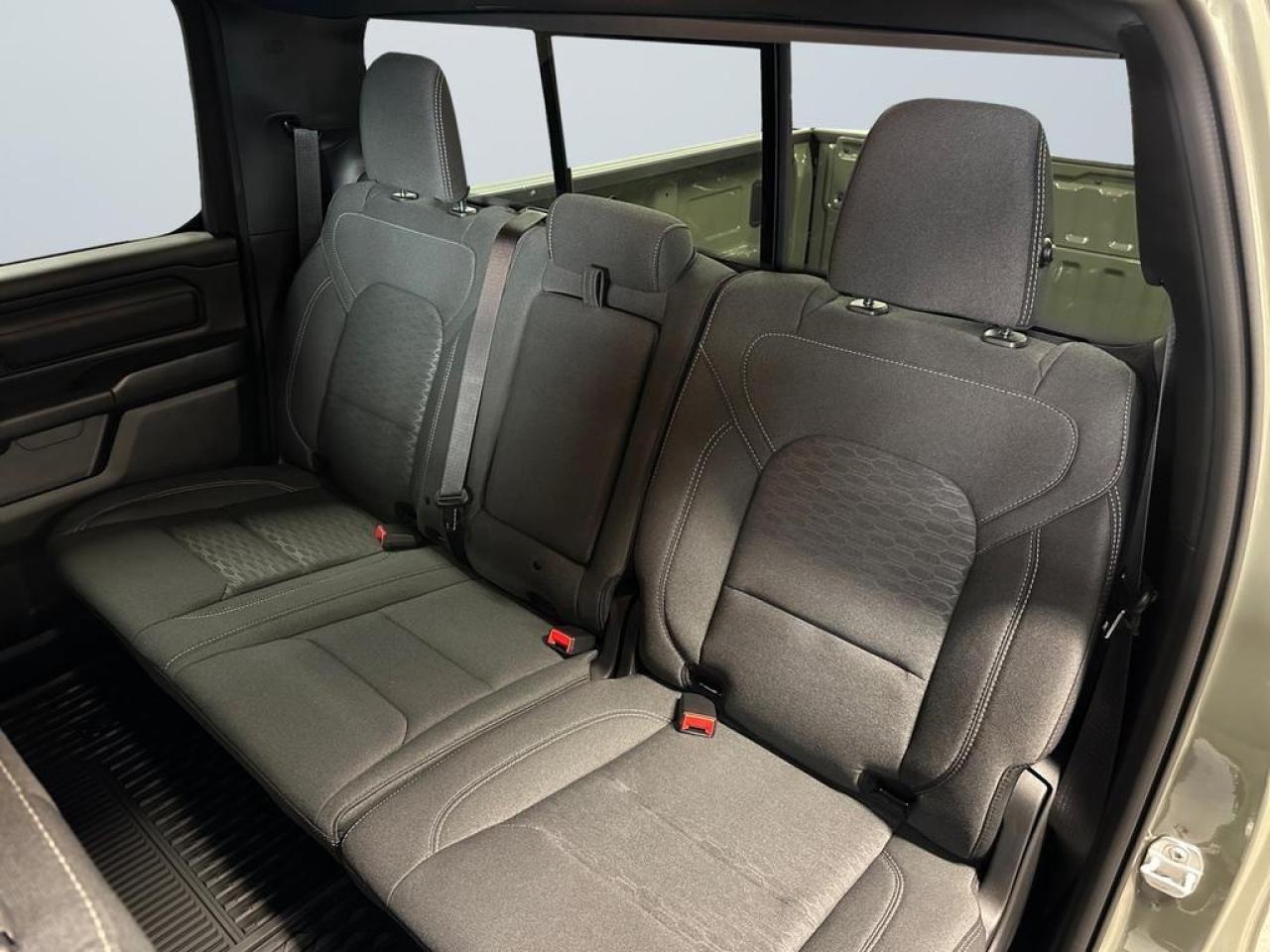 Inside, enjoy cloth bench seating, 8.4-inch Uconnect touchscreen, Apple CarPlay/Android Auto, Bluetooth, 6-speaker audio, rear power sliding window, and dual-zone climate control. Practical features include capless fuel fill, pickup box, full-size spare, 400W inverter, and class IV receiver hitch.