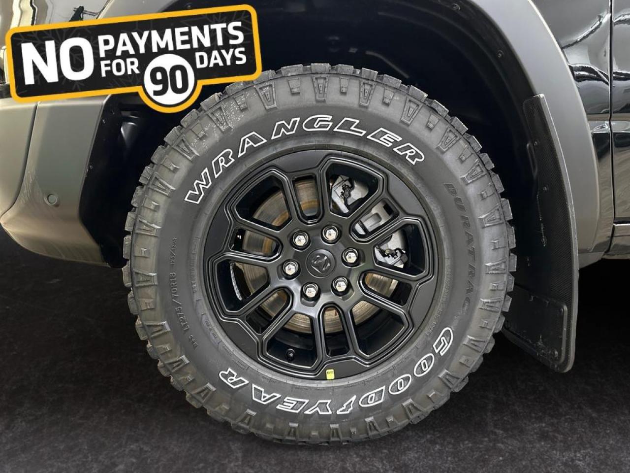 Its rugged exterior includes black grille, headlamp bezels, sport performance hood, dual exhaust with black tips, off-road wheel flares, and 18-inch black wheels. Inside, enjoy cloth/vinyl bucket seats, heated front seats, 12-inch Uconnect touchscreen, Apple CarPlay/Android Auto, GPS navigation, Bluetooth, 9-speaker subwoofer audio, dual-zone climate control, and rear power sliding window.