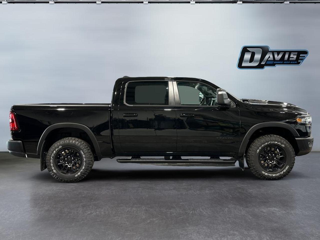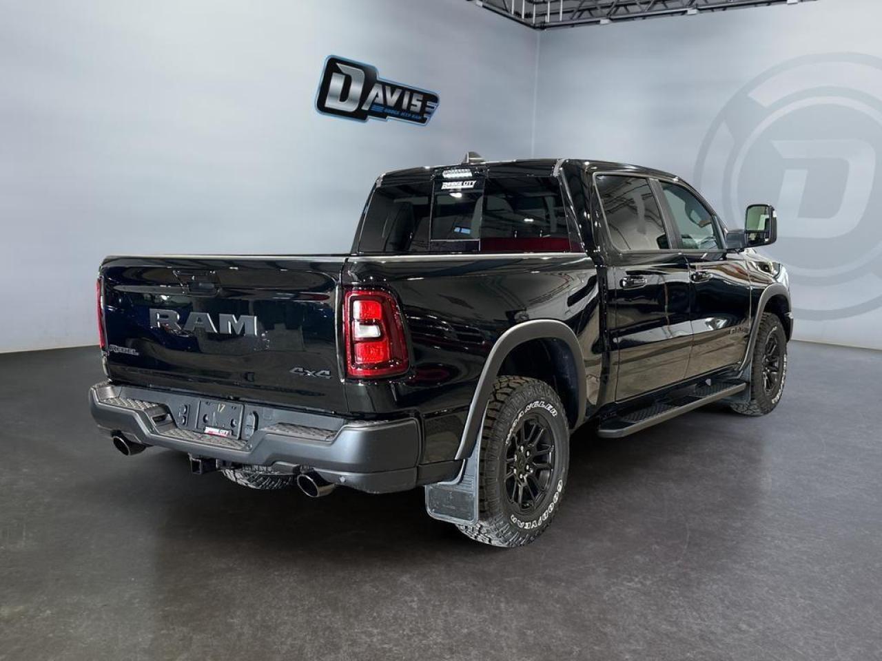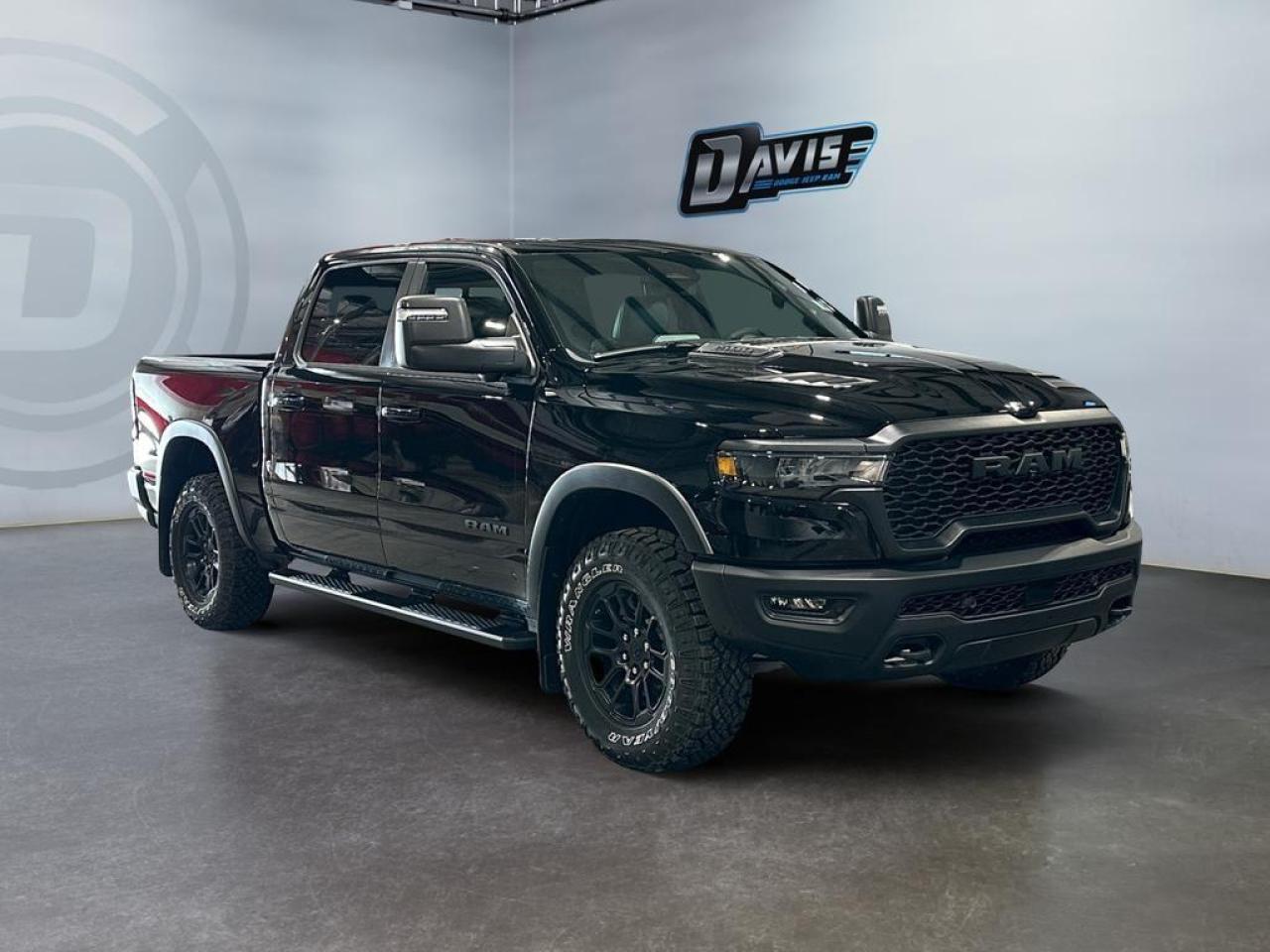 The 2026 Ram 1500 Rebel in Diamond Black Crystal delivers rugged capability with premium comfort and advanced tech. Powered by a 3.0L I6 Hurricane Twin-Turbo engine and 8-speed automatic transmission with 4x4 drivetrain, it features Rebel-tuned front and rear performance shocks, raised ride height, off-road wheel flares, skid plates, tow hooks, and Class IV receiver hitch, built for off-road adventures and heavy towing.