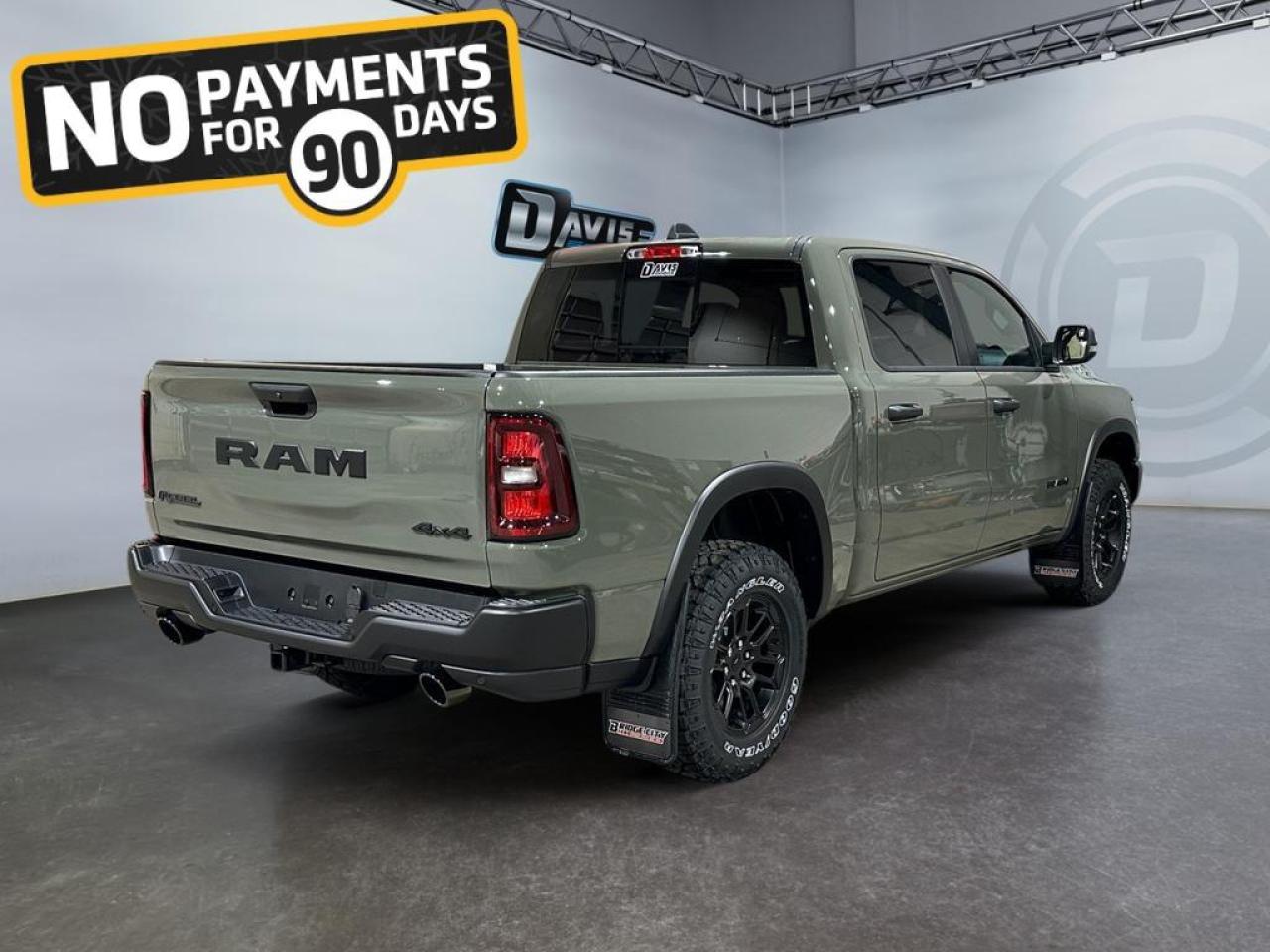 The 2026 Ram 1500 Rebel combines rugged style and off-road performance. Finished in Diamond Black Crystal Pearl, it features a 3.0L I6 Twin-Turbo Hurricane engine, 8-speed automatic transmission, and 4x4 drivetrain with raised ride height, E-locker rear axle, and off-road wheel flares for superior capability on any terrain.