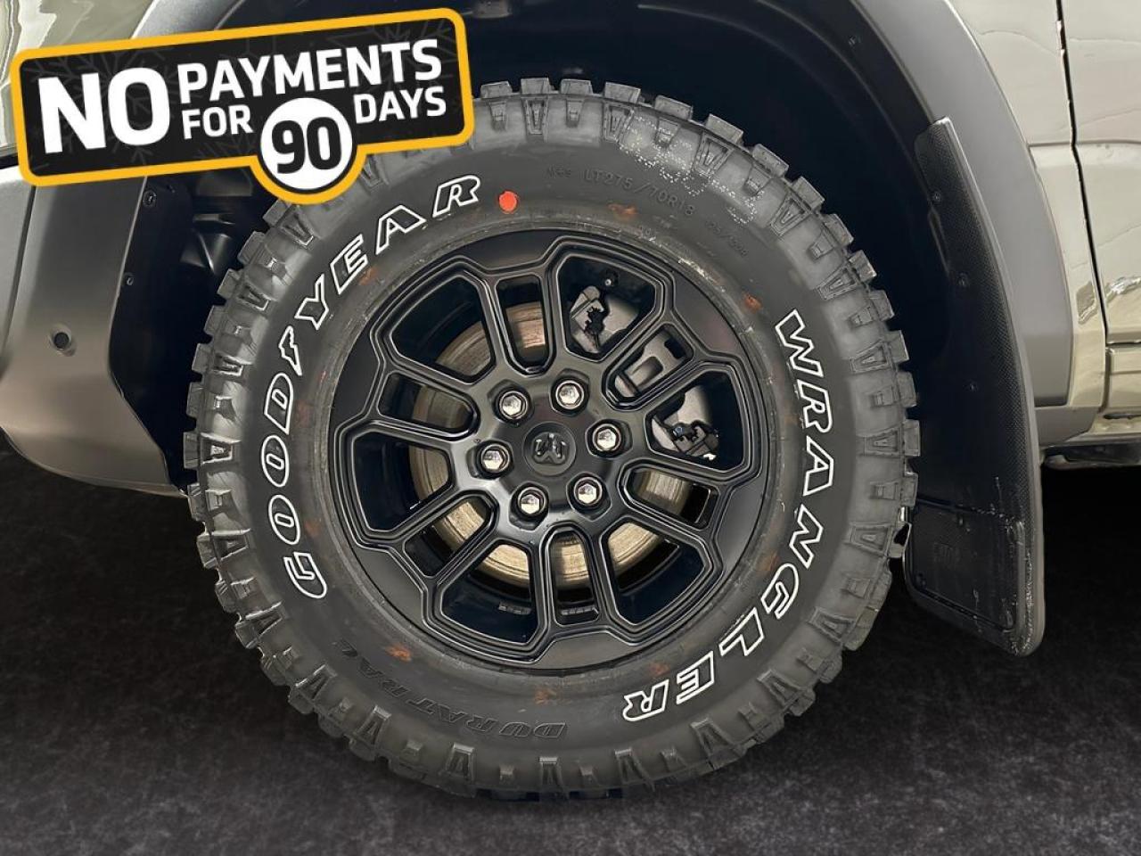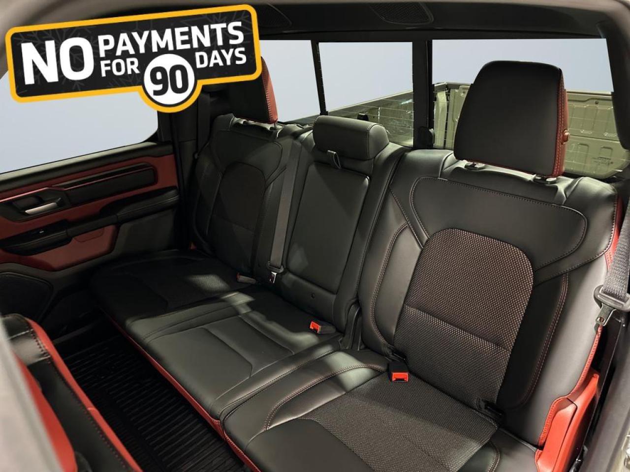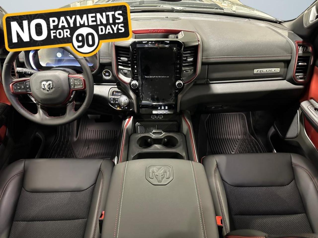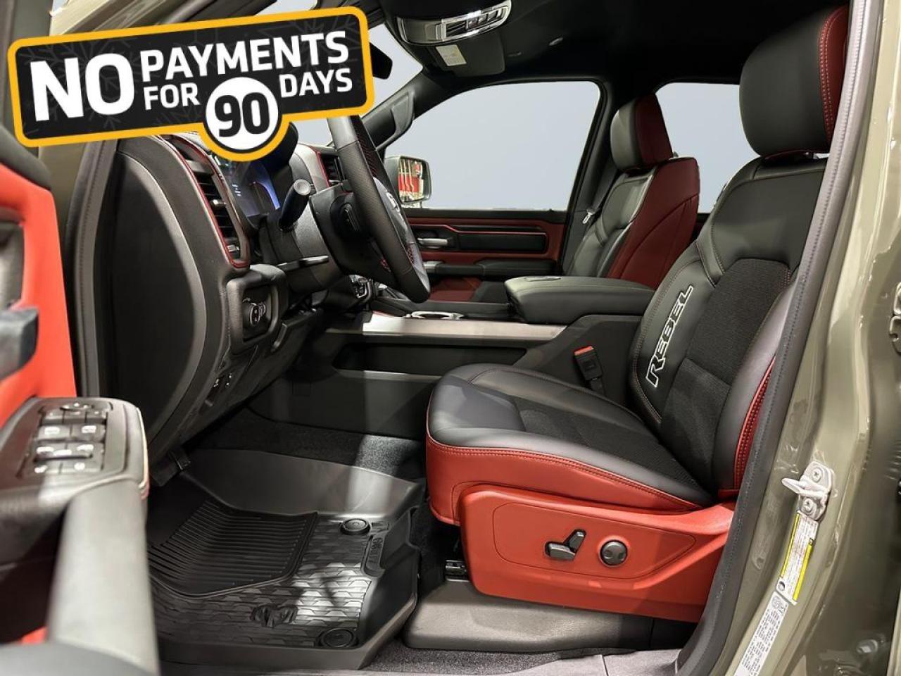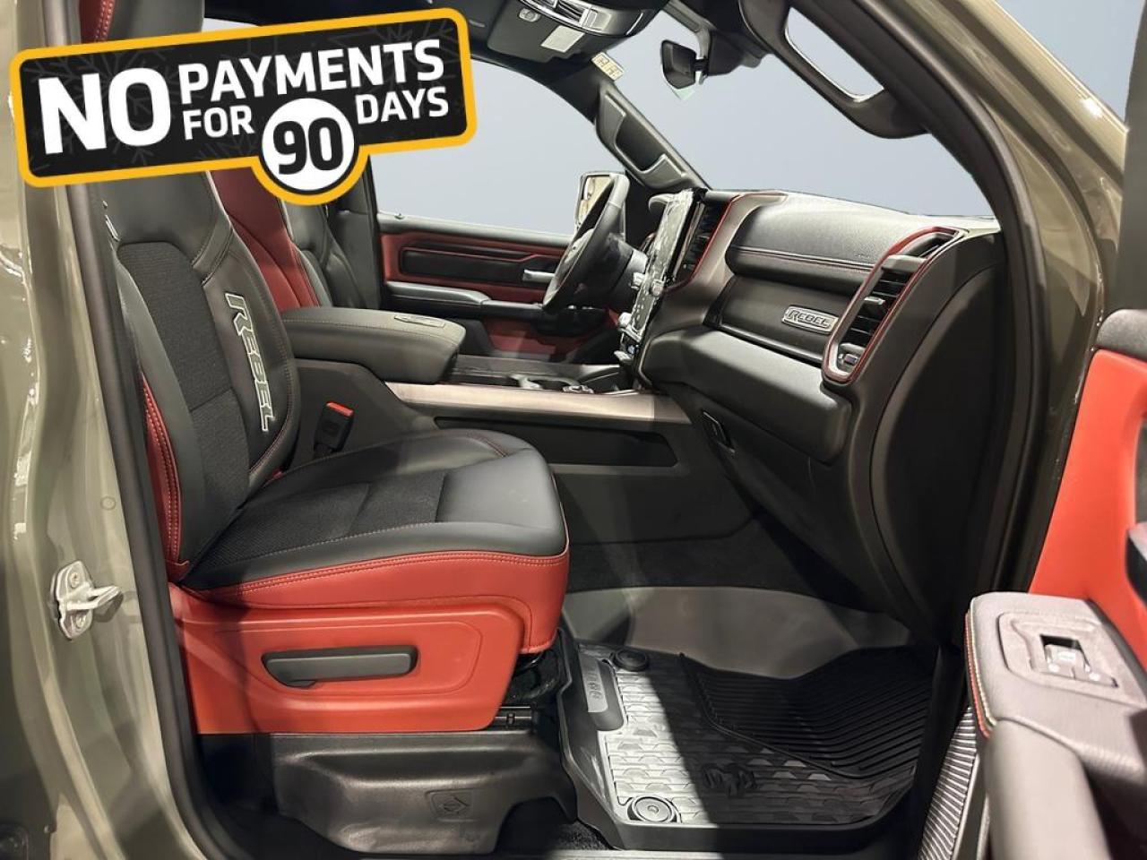 Safety and driver assistance include Adaptive Cruise Control with Stop & Go, Blind Spot and Cross Path Detection, ParkView rear camera, Pedestrian Emergency Braking, and Active Lane Management. Exterior features such as black grille and headlamp bezels, 18 painted black wheels, black door handles, and Mopar rubber floor mats make this Rebel as stylish as it is capable.