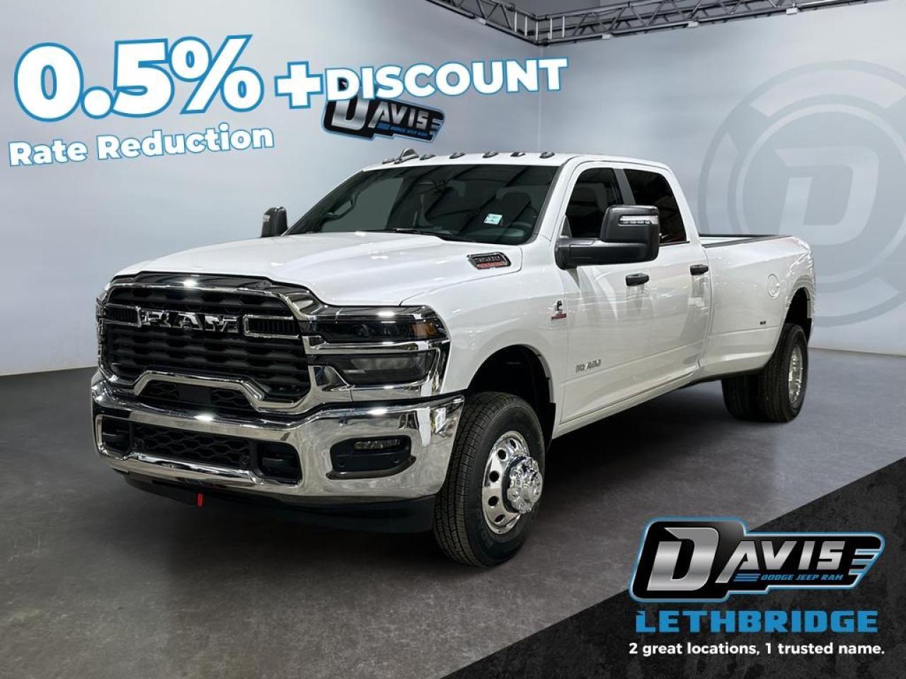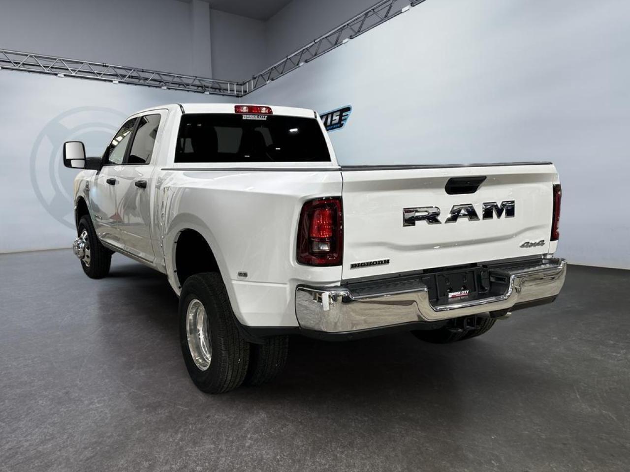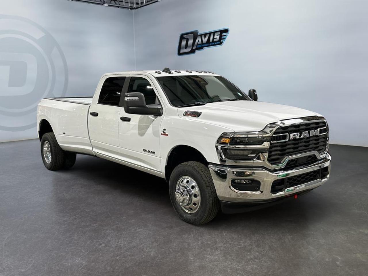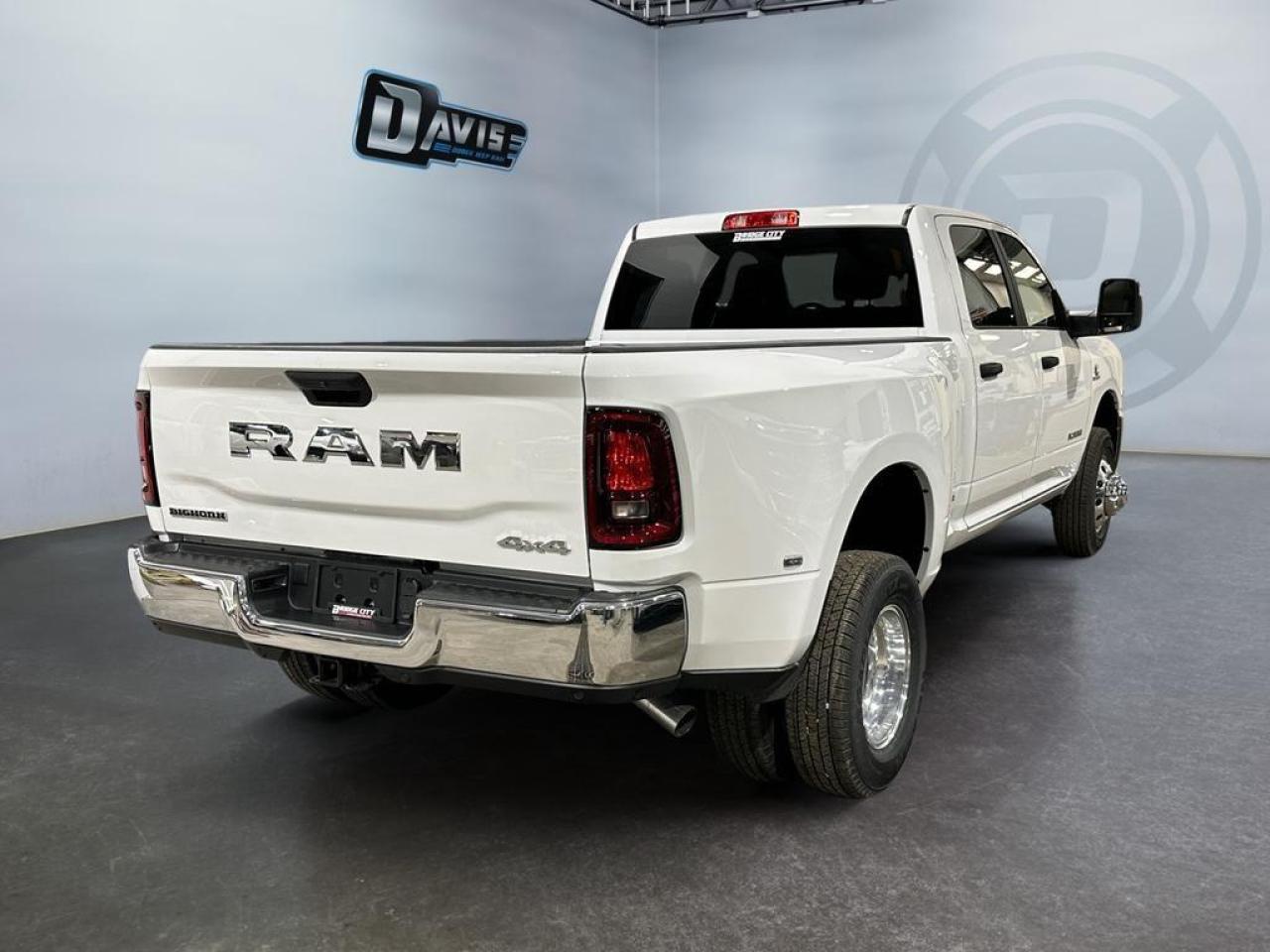 The 2026 Ram 3500 Big Horn Dually Crew Cab in Bright White is built for maximum power and heavy-duty performance. Equipped with the 6.7L Cummins High-Output Turbo Diesel engine paired with an 8-speed TorqueFlite HD automatic transmission, this 4x4 dually offers exceptional towing and payload capacity. Features like the 5th-wheel/gooseneck prep, Class V receiver hitch, dual rear wheels, trailer brake control, and heavy-duty engine cooling ensure you can tackle the toughest jobs with confidence.