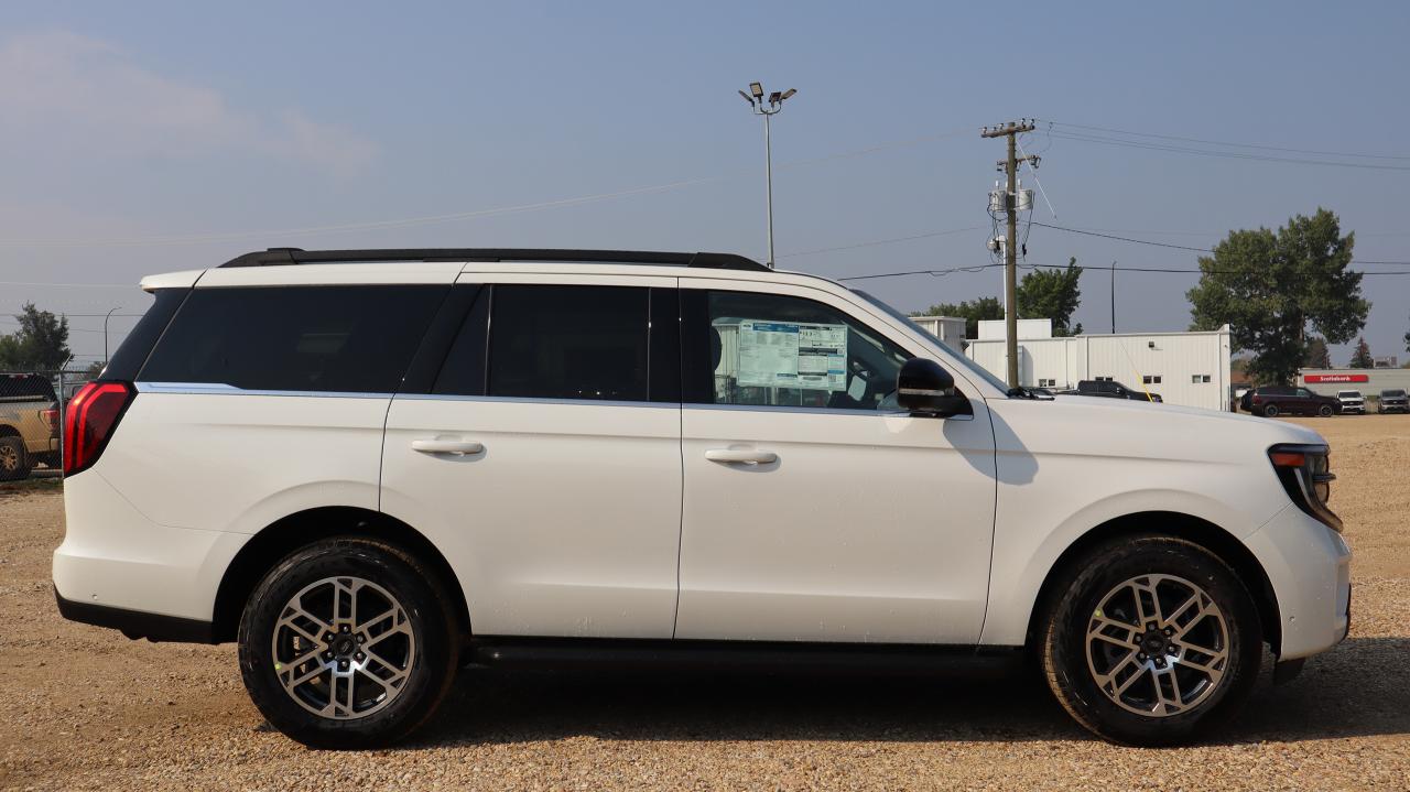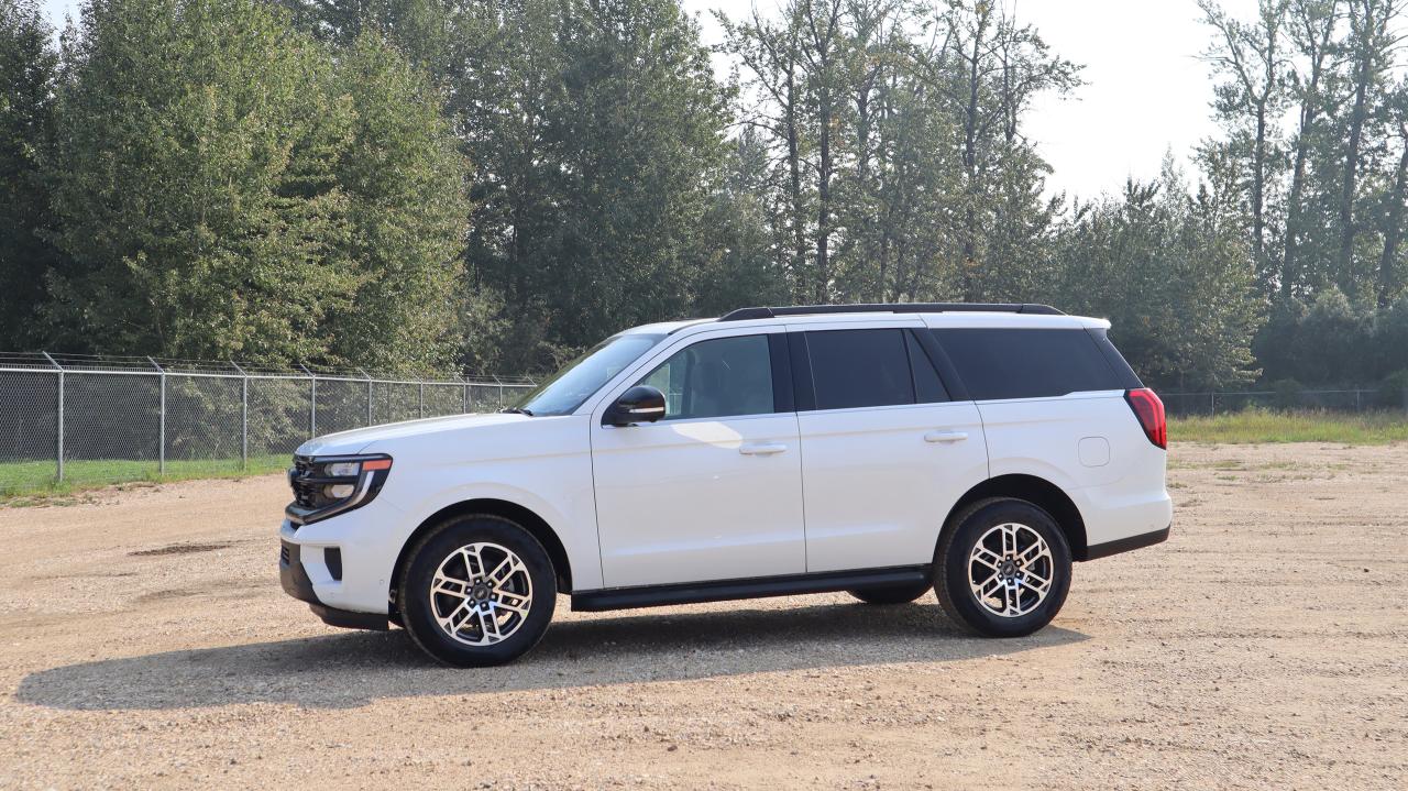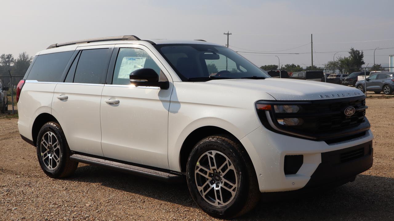 The 2025 Ford Expedition Active in Star White Met Tri-Coat delivers full-size SUV capability with premium comfort and smart technology. Its bold design is enhanced with 20" Carbonized Grey bright machined aluminum wheels, running boards/side steps, rear spoiler, and a power liftgate, combining style with practicality.