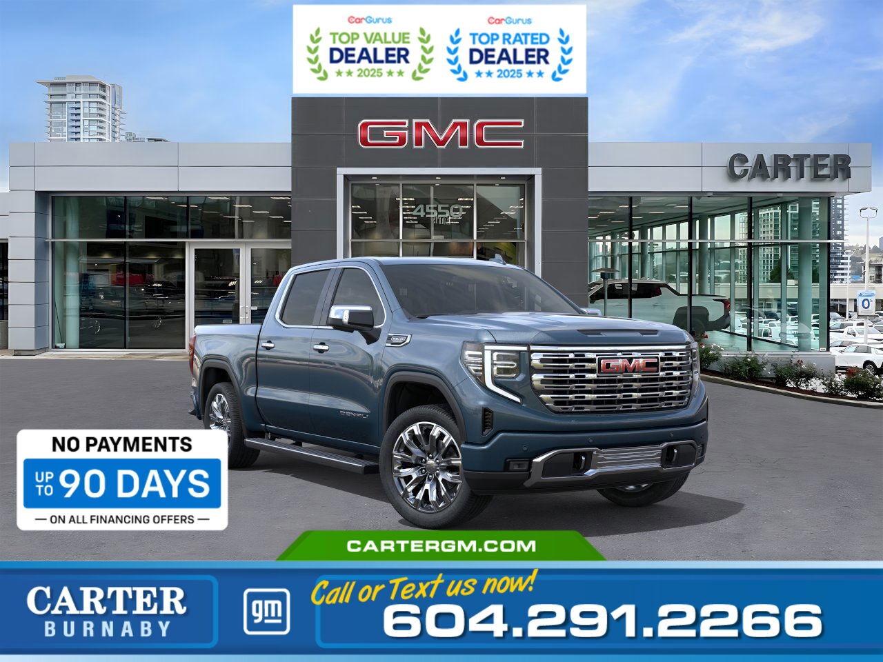 Purchase your new vehicle today and enjoy NO PAYMENTS FOR UP TO 90 DAYS. Upgrade with confidence, without stretching your budget! Luxury, power, and technology define the 2026 GMC Sierra 1500 Denali. Its 5.3L EcoTec3 V8 and Denali Premium Suspension with Adaptive Ride Control deliver strength and refined comfort, while the MultiPro Tailgate and integrated trailer brake controller make towing effortless. Inside, enjoy heated 12-way power seats, wireless charging, dual-zone climate control, and advanced displays with a 13.4" touchscreen and 12.3" digital driver centre. Safety is unmatched with Hitch Guidance, Bed View Camera, Trailer Side Blind Zone Alert, and Rear Cross Traffic Braking. Come take it for a test drive today and experience all this stylish vehicle has to offer! WHY CARTER GM BURNABY? - An unrivalled vehicle purchasing experience! - Exceeding our loyal customer's expectations since 1963 - 4.5 Google star rating with 2,175+ customer reviews) - CarGurus Top-Rated Dealer 2025 Award - CarGurus Top Value Dealer 2025 Award - Vehicle trades welcome! Best price guaranteed! - We provide upfront pricing, zero hidden fees, and 100% transparency - Fast approvals and 99% acceptance rates (no matter your current credit status!) - Multilingual staff (many languages spoken) - Comfortable non-pressured environment with in-store television, WIFI and a children's play area! - In-store restaurant: fresh daily menu We're here to help you drive the vehicle you want, the vehicle you deserve! QUESTIONS? GREAT! WE'VE GOT ANSWERS! To speak with a friendly vehicle specialist - CALL NOW! (Doc. Fee: $495.00 Dealer Code: D5505)
