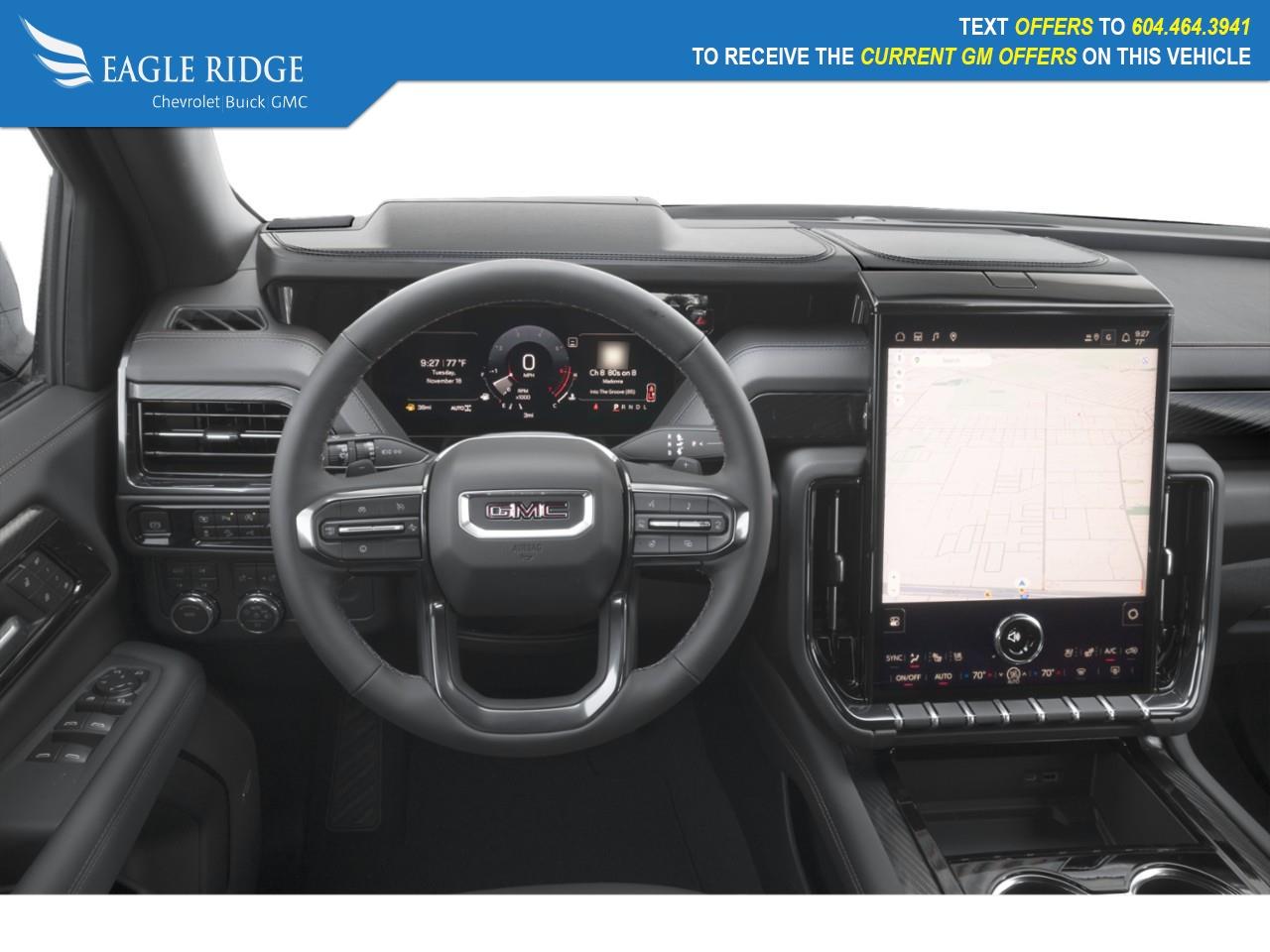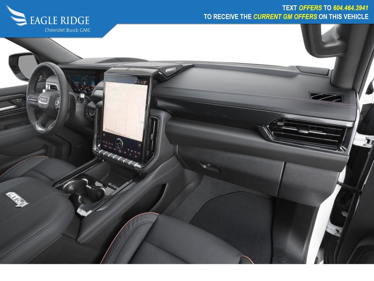 20" machined aluminum wheels, front skid plate with red recovery hooks, Magnetic Ride Control Suspension, AutoSense power liftgate, heated and ventilated leather seats, backup cameras, and lane keep assist. Available: 16.8" premium GMC infotainment system, Apple CarPlay, Android Auto, Premium Capability Package with Active Response 4WD,