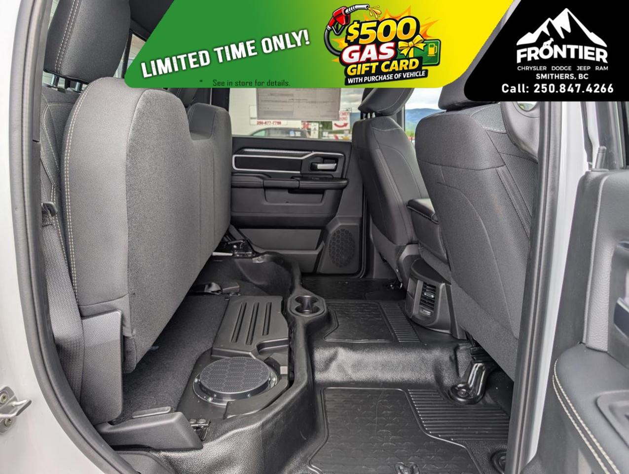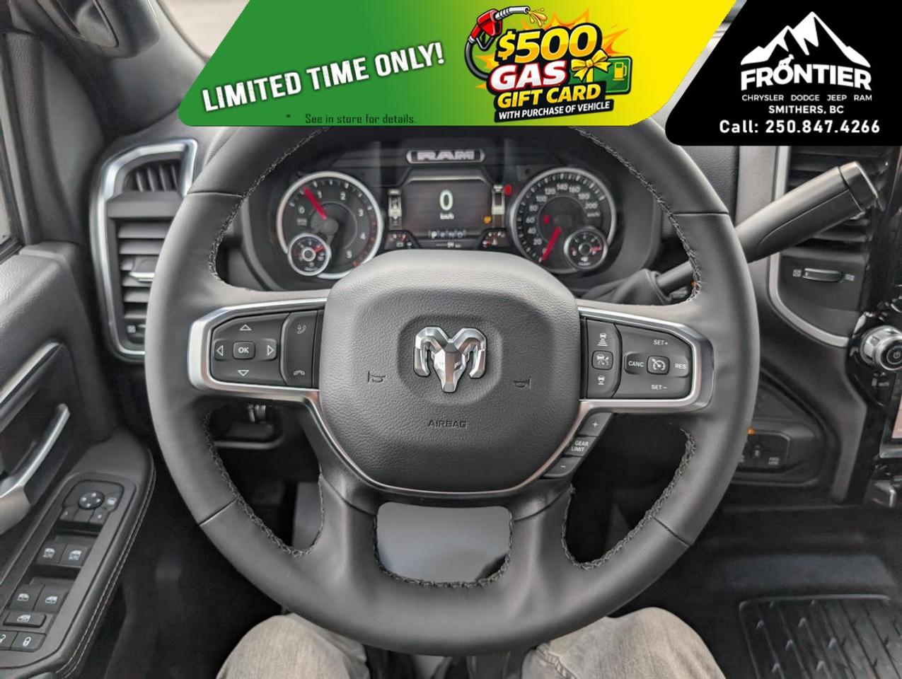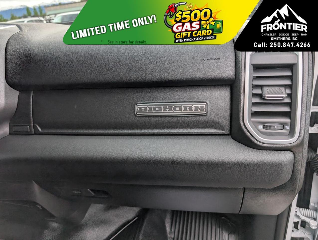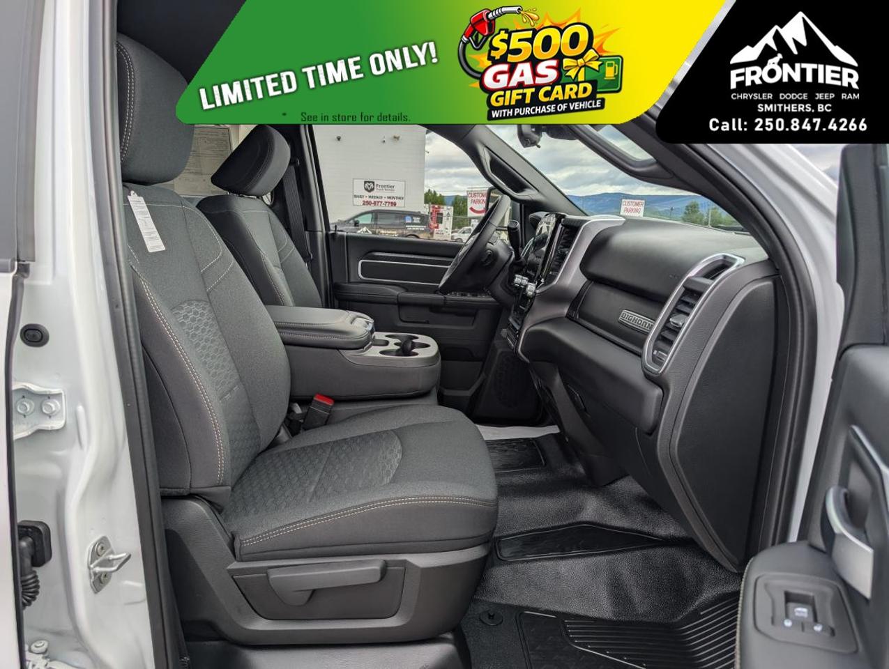 On the outside, the vehicle showcases a bright grille surround and a matte black mesh grille, paired with a bright front bumper for an eye-catching appearance. Its heated exterior mirrors and mirror running lights enhance functionality and visibility, while the crisply designed RAM door badges and black-out tape add a touch of sophistication.