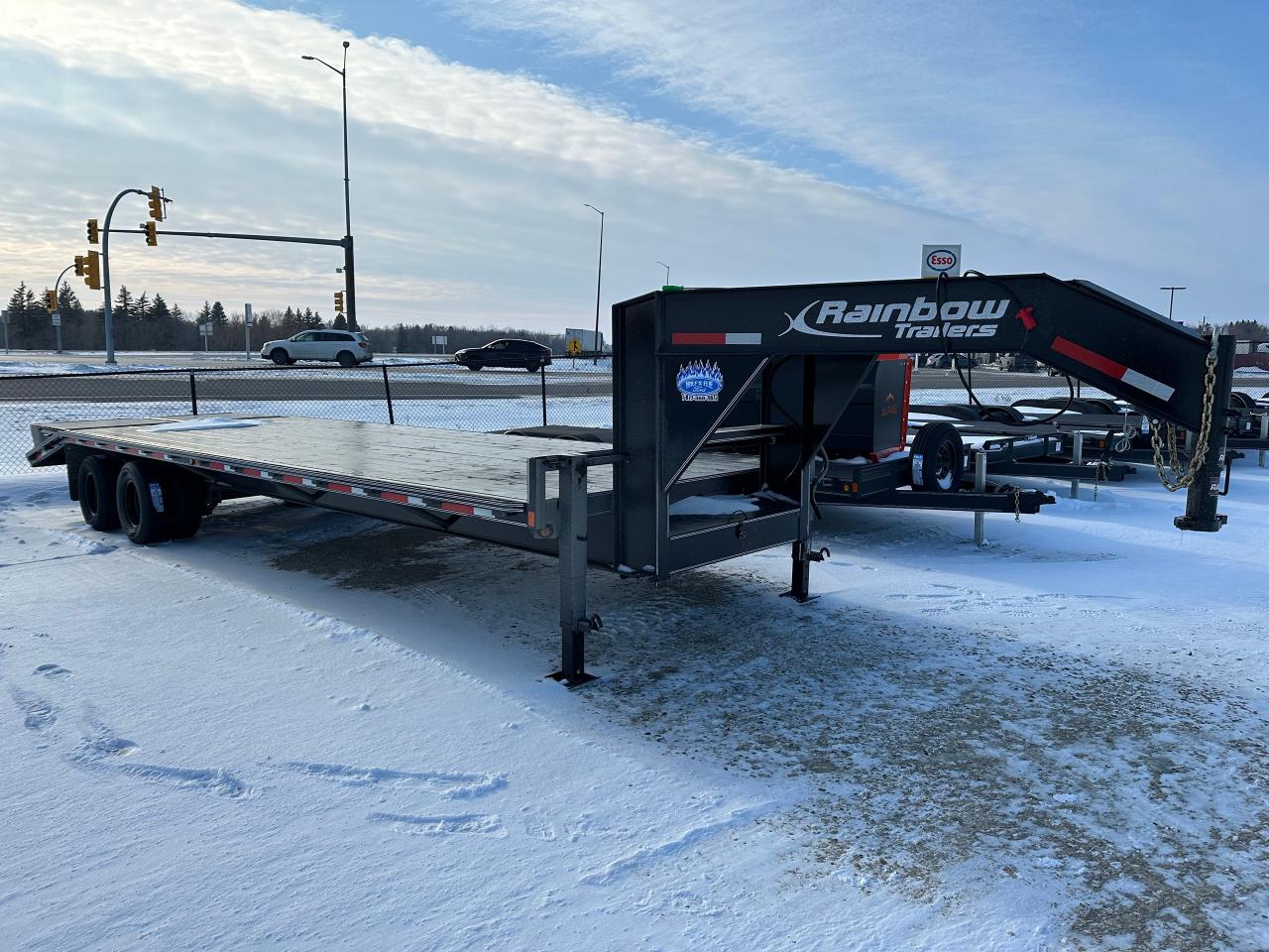 Rainbow Excursion Deck Over Gooseneck with tandem 12,000 lb axles, gooseneck ball coupler, mud flaps, 2-44" flip over spring assist ramps, rub rail, spare tire and holder, undermount tool box, winch plate in neck.