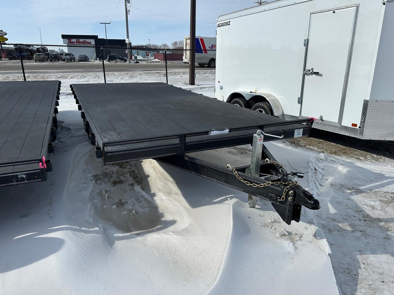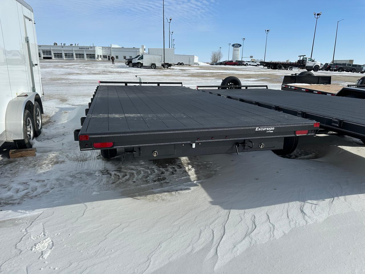 18' Rainbow Excursion Deck Over, tandem 5200 lb axles, 9900 lb GVWR, 2601 lbs curb weight, spare tire holder, LED lights, silver graphics package, 2" painted spruce floor, advanced hybrid polyurea coating exterior finish, heavy duty stake pockets, wiring enclosed in poly conduit, height adjustable coupler, 31" deck height, 8' slide in ramps. Stock# HH. For more info call Wilf's Elie Ford toll free 877-360-3673. Dealer# 0521.
