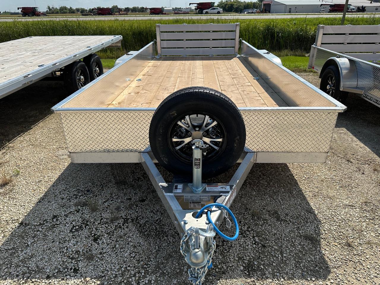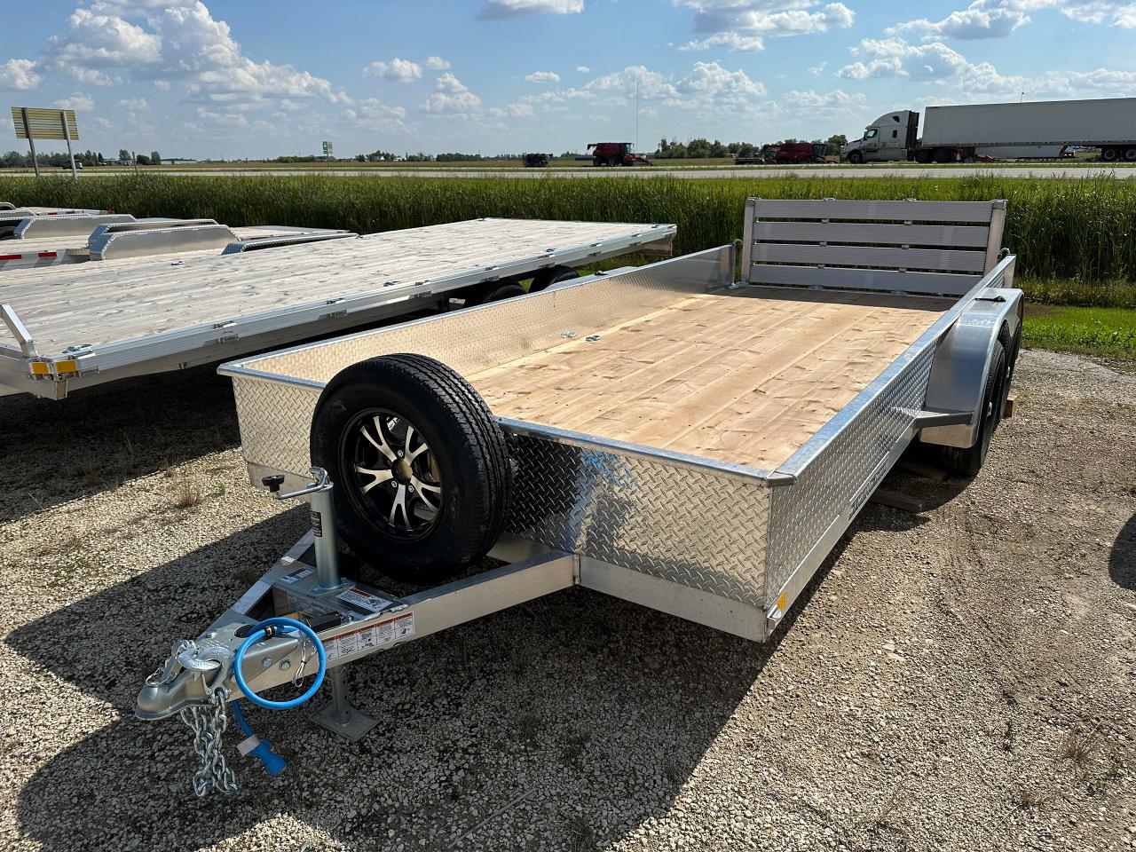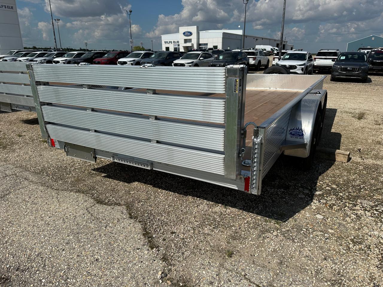 7000# GVWR, all aluminum frame, 15" side height, tandem 3500lbs spring idler axles, zinc plated axle mounting brackets, 7 way RV style electrical connector, 2 5/16" ball coupler, ST205/75R15 Radial tires, LED lights, enclosed wiring, a-frame mounted jack, 2 x 10 DouglasFir/Larch plank floor, 5/16 safety chains, folding rear ramp rated at 3000lbs, 6-4000lbs tie downs, spare tire mount, aluminum wheels, aluminum spare. Stock# HH5396. For more info call Wilf's Elie Ford toll free 877-360-3673. Dealer# 0521.