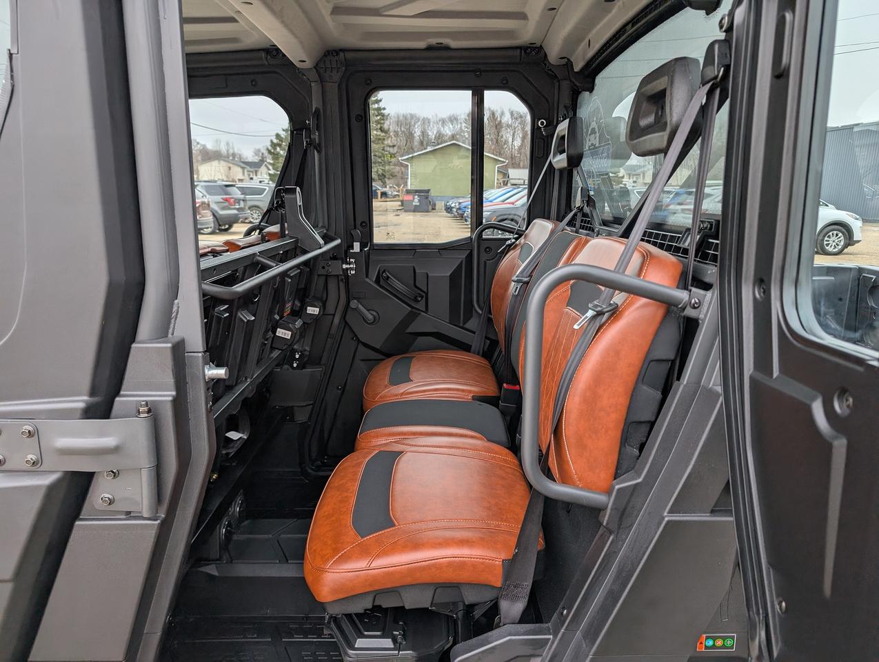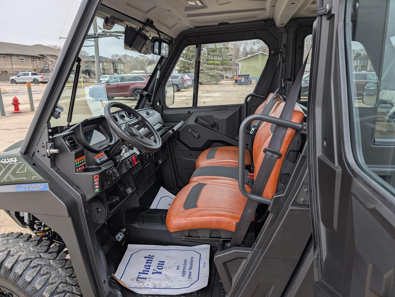 Equipped with a heating and cooled cab, a 976cc V-twin engine. Selectable 2WD-4WD-4WD front locking differential, TURF MODE. Independent dual A-arm front & rear, front wiper and washer fluid, and adjustable coil over spring rate. 3 mode adjustable power steering, and a 3500lb winch. Factory Bead lock wheels and light bar. Factory Apple CarPlay/Android Auto, and front and rear facing cameras. MATTRACKS kits in-stock.