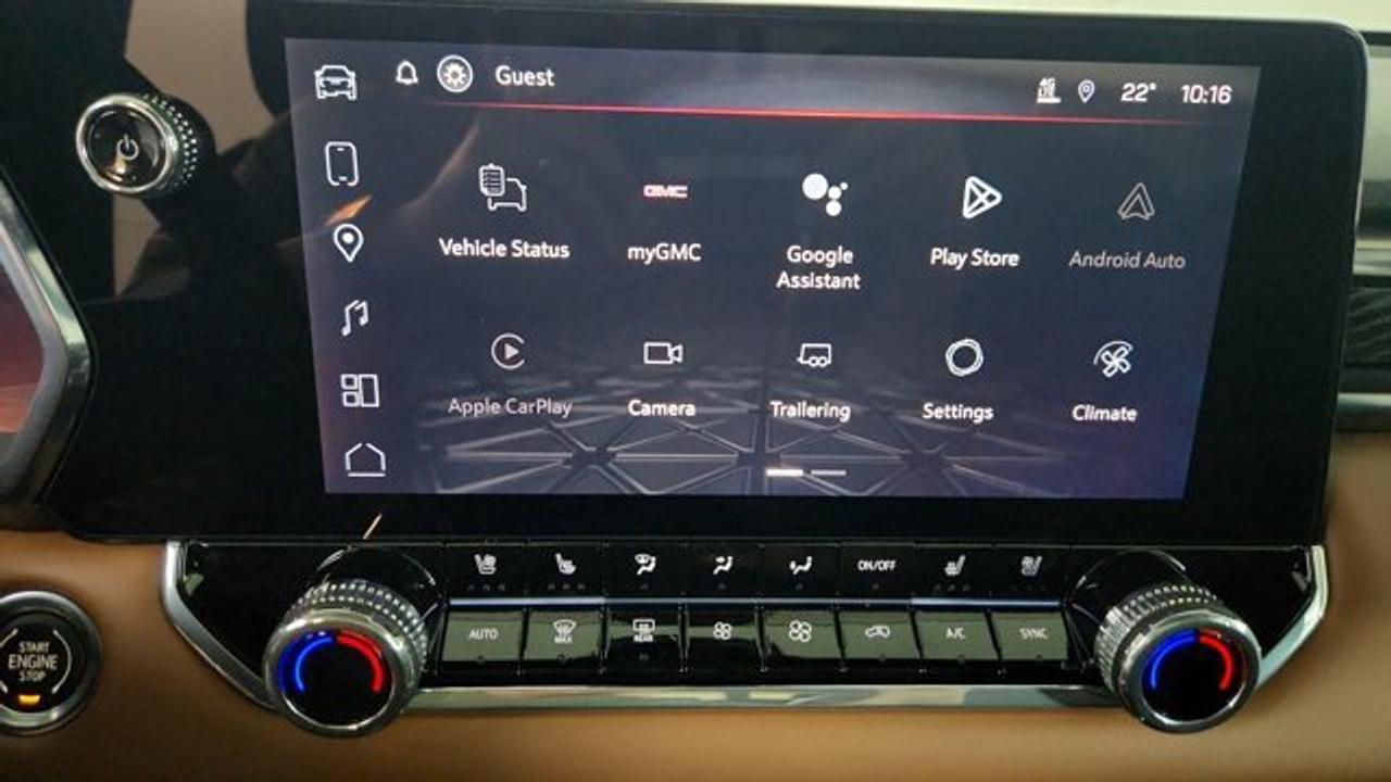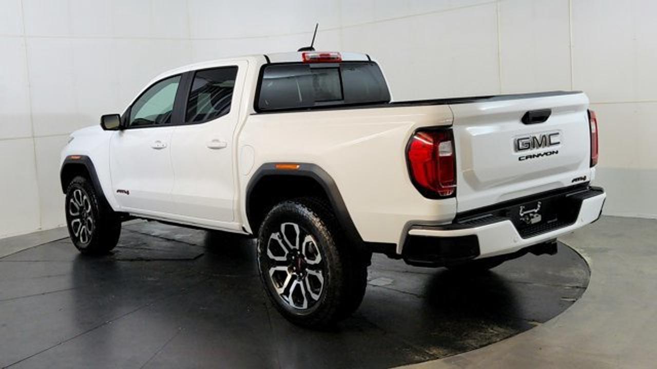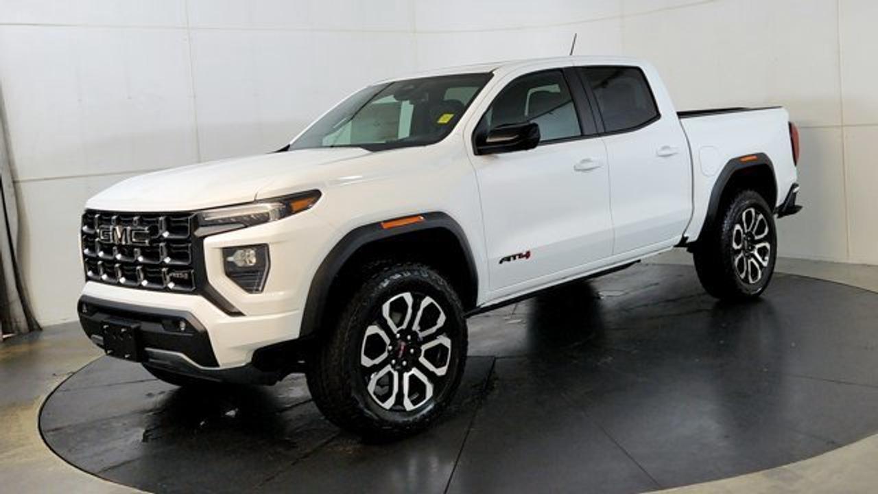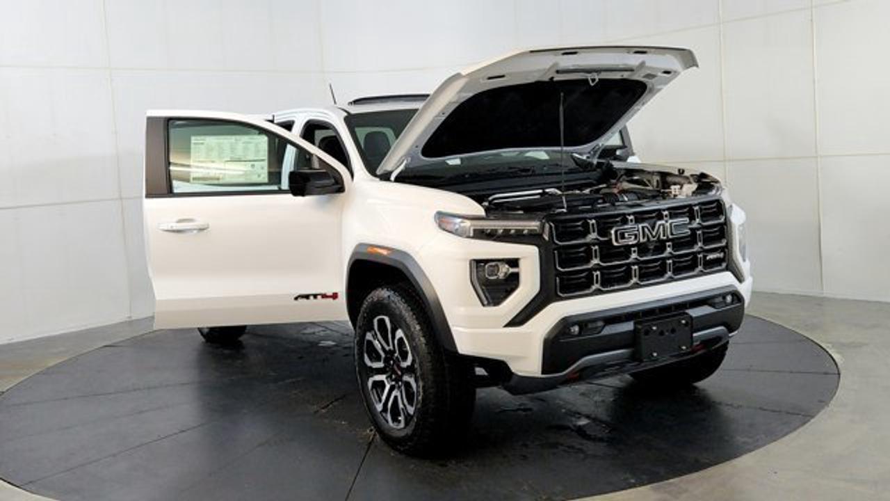 The 2026 GMC Canyon AT4 is an off-road--focused midsize pickup that comes standard with a 2-inch factory lift, an ultra-wide track, and 4WD equipped with a two-speed AutoTrac transfer case, automatic locking rear differential, and advanced Hill Descent Control. This unit rolls on 20 AT blackwalls overtop a black aluminum wheel. Under the hood, it's powered by the potent TurboMax 2.7 L turbocharged inline-4 engine delivering 310 hp and 430 lb-ft of torque, with a max towing capacity of up to 7,700 lbs. Inside, the AT4 features a modern 11.3-inch center infotainment touchscreen, an 11-inch digital driver information display, leather heated and ventilated front seats, wireless charging, a sunroof and adaptive cruise control.
