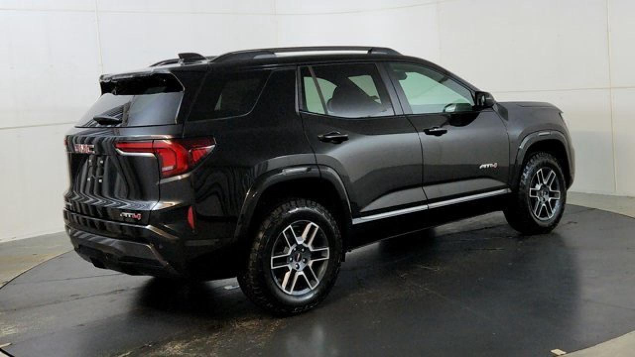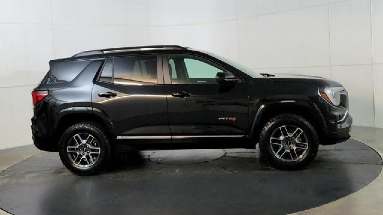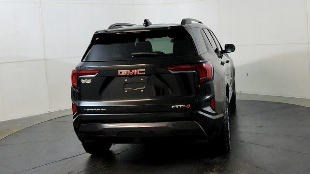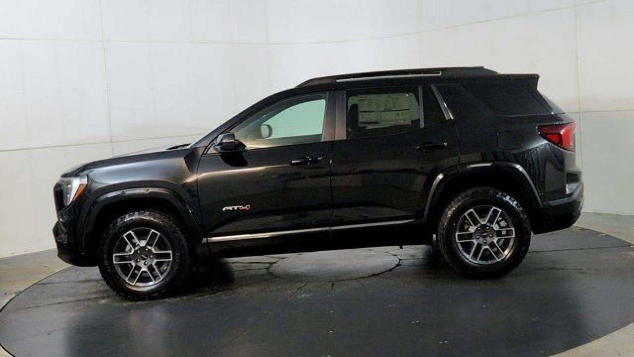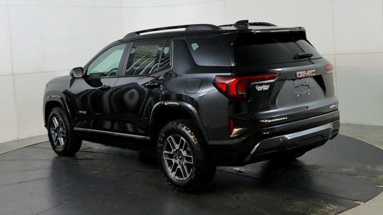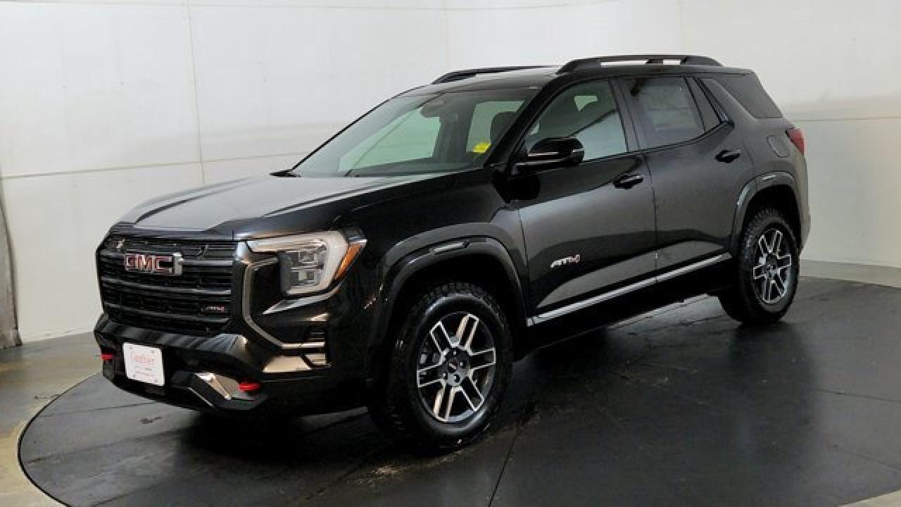 The 2026 GMC Terrain AT4 takes the compact SUV to adventurous new heights with a lifted ride height, a front skid plate with steel underbody shielding, and red recovery hooks paired with 17-inch dark-machined aluminum wheels wrapped in all-terrain tires for credible off-road chops. It also brings AT4-exclusive features like a selectable Terrain drive mode, all-wheel drive, hill descent control, and animated exterior lighting---while delivering everyday usability thanks to a 1.5 L turbocharged four-cylinder engine and an 8-speed automatic transmission. Inside there's a sunroof, a full suite of safety and infotainment tech including a 15-inch touchscreen and Google-integrated connectivity. With a dual-zone climate control, heated front seats and steering wheel, and standard driver-assist systems, it balances rugged capability with modern comfort and convenience.