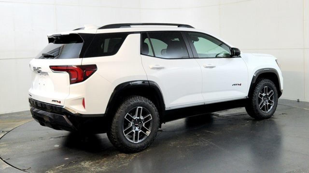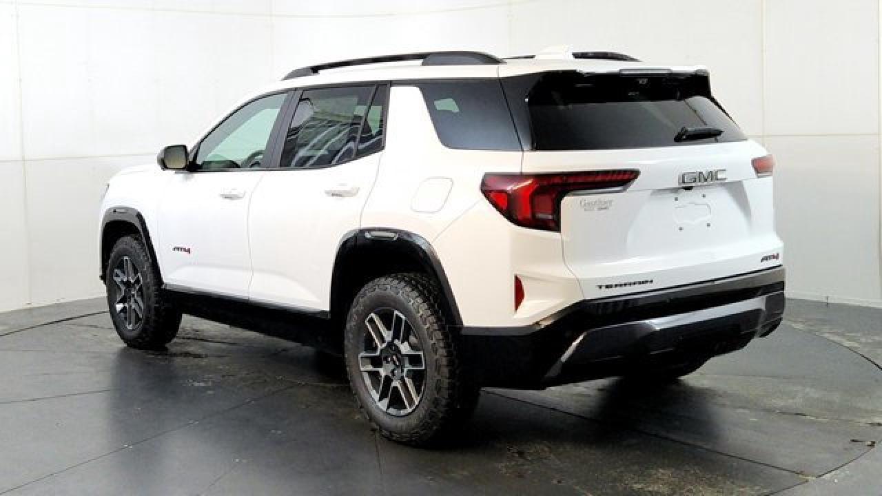 The 2026 GMC Terrain AT4 takes the compact SUV to adventurous new heights with a lifted ride height, a front skid plate with steel underbody shielding, and red recovery hooks paired with 17-inch dark-machined aluminum wheels wrapped in all-terrain tires for credible off-road chops. It also brings AT4-exclusive features like a selectable Terrain drive mode, all-wheel drive, hill descent control, and animated exterior lighting---while delivering everyday usability thanks to a 1.5 L turbocharged four-cylinder engine, 8-speed automatic transmission. Inside there's heated and ventilated seats and a sunroof. There's a full suite of safety and infotainment tech including a 15-inch touchscreen and Google-integrated connectivity, HD Surround vision. With a dual-zone climate control, heated front seats and steering wheel, and standard driver-assist systems, it balances rugged capability with modern comfort and convenience.