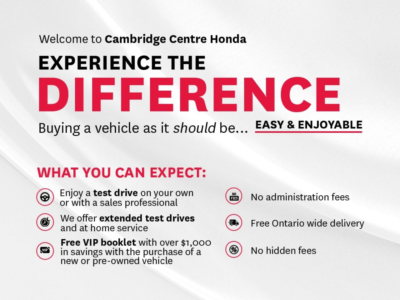 Experience the Difference at Cambridge Centre Honda! Why Test Drive Here? You choose: drive with a sales person or on your own, extended overnight and at home test drives available. Why Purchase Here? VIP Coupon Booklet: up to $1000 in service & other savings, FREE Ontario-Wide Delivery. Cambridge Centre Honda proudly serves customers from Cambridge, Kitchener, Waterloo, Brantford, Hamilton, Waterford, Brant, Woodstock, Paris, Branchton, Preston, Hespeler, Galt, Puslinch, Morriston, Roseville, Plattsville, New Hamburg, Baden, Tavistock, Stratford, Wellesley, St. Clements, St. Jacobs, Elmira, Breslau, Guelph, Fergus, Elora, Rockwood, Halton Hills, Georgetown, Milton and all across Ontario!