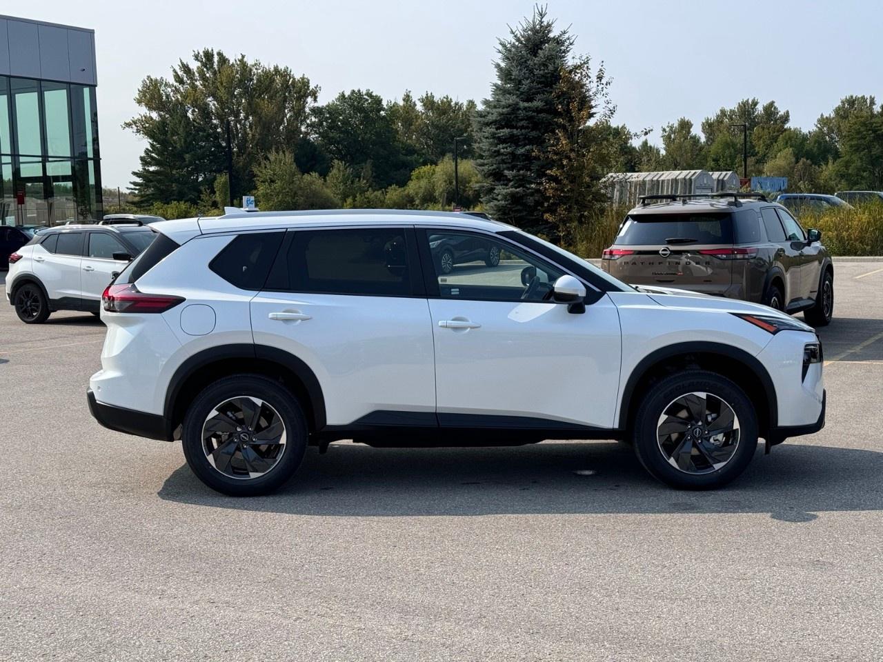 The 2026 Nissan Rogue SV Moonroof in pristine white with an AWD drivetrain ensures a confident and smooth ride, making it a perfect fit for any journey, be it city or countryside. This SUV commands attention with its stylish alloy wheels and the enticing contrast between its eye-catching white exterior and sophisticated black interior.