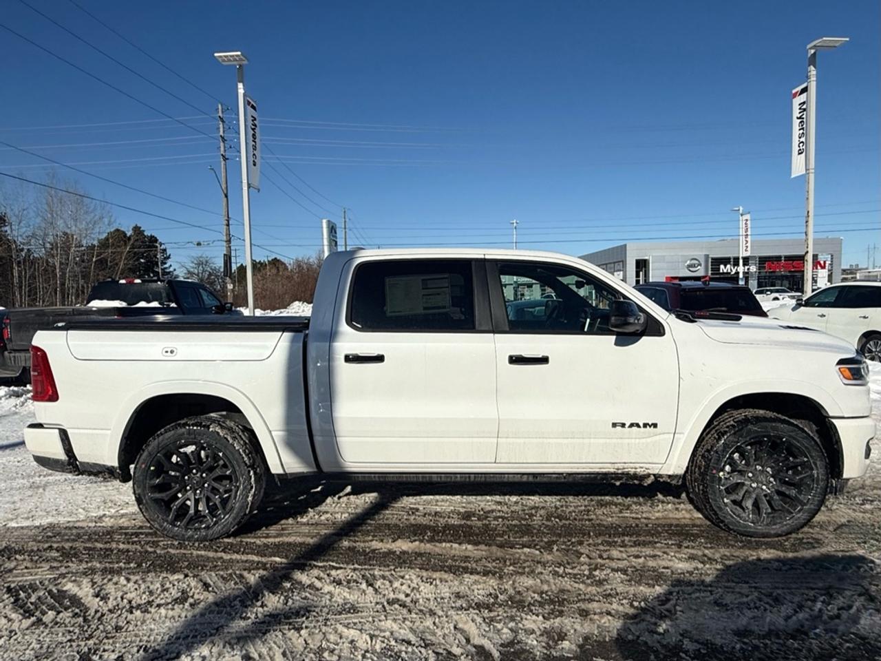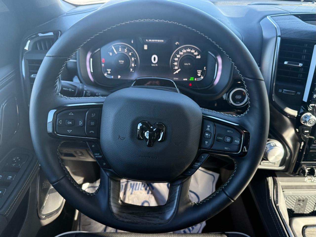 Our 1500's trim level is Limited. A power tailgate, power running boards, power-adjustable pedals and auto-leveling suspension are among the great upgrades you enjoy in this Ram 1500 Limited. Also standard include ventilated and heated front and rear seats, massaging front seats, leather upholstery, a heated leather steering wheel, a 19-speaker harman/kardon audio system, and a 12-inch infotainment screen powered by Uconnect 5W with inbuilt navigation, Apple CarPlay, Android Auto and 4G LTE Wi-Fi hotspot. Additional features include class IV towing equipment, a trailer wiring harness, front and rear parking sensors, blind spot detection, lane keeping assist with lane departure warning, remote start, adaptive cruise control, and even more! This vehicle has been upgraded with the following features: Night Edition, Sunroof, Leather Seats, Bed Utility Group.