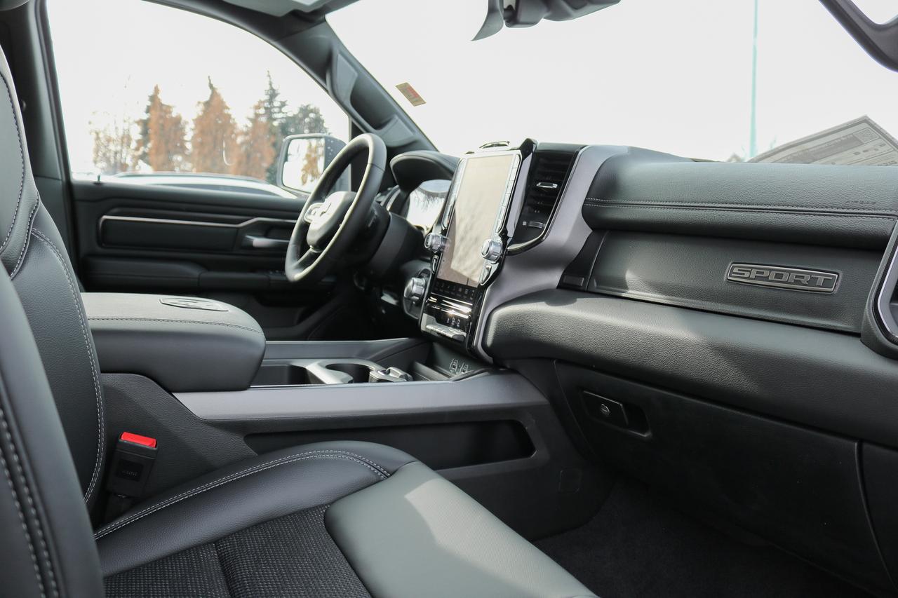 Bold and refined, our New 2026 RAM 1500 Sport Crew Cab 4X4 in Granite Crystal Metallic delivers stylish strength that stands out anywhere. Motivated by a Twin-TurboCharged 3.0 Litre Hurricane 6 Cylinder generating 420hp for an 8 Speed Automatic transmission. This Four Wheel Drive truck loves to tow and haul with that setup, and it achieves approximately 9.7L/100km on the highway. Dynamic exterior details include LED lighting, fog lamps, 20-inch black alloy wheels, a damped tailgate, and heated power-folding mirrors. Our Sport cabin is specially crafted for active owners who prefer features such as heated cloth front seats, 12-way power driver's seat, leather-wrapped steering wheel, dual-zone automatic climate control, power-adjustable pedals, remote start, keyless access/ignition, powered rear window, and top-shelf technologies. The Uconnect® infotainment system bundles a 12-inch touchscreen, a 12-inch driver display, full-colour navigation, voice recognition, Apple CarPlay®, Android Auto®, Bluetooth®, and 10-speaker audio. RAM encourages safer trucking with automatic braking, forward collision warning, a surround-view camera system, trailer-compatible blind-spot monitoring, rear cross-traffic alert, trailer-sway damping, electronic stability/traction control, hill start assist, and more. Committed to truck leadership, our 1500 Sport is a compelling choice! Save this Page and Call for Availability. We Know You Will Enjoy Your Test Drive Towards Ownership!