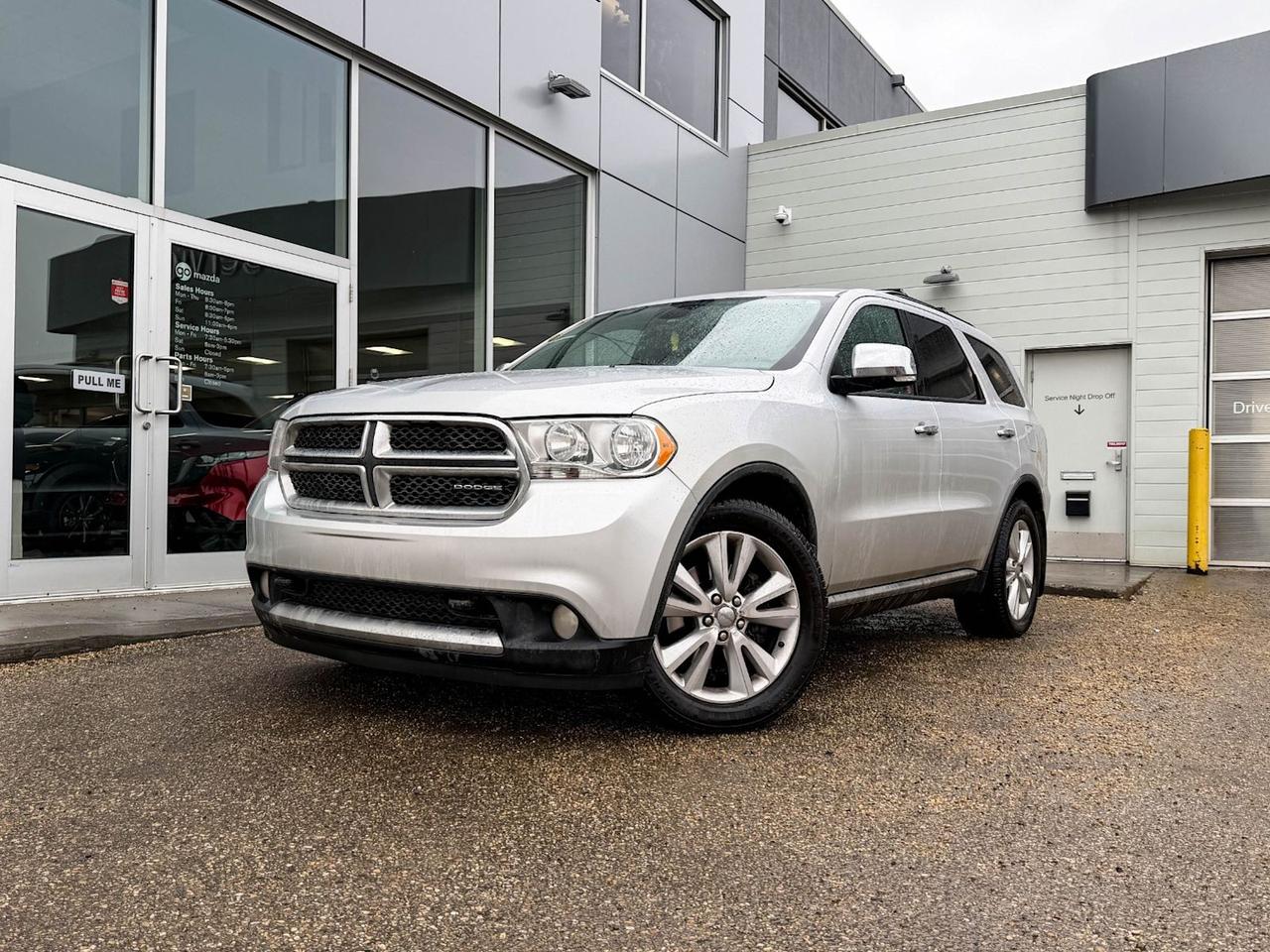 Discover rugged capability and versatile comfort with this pre-owned 2011 Dodge Durango Crew Plus 4WD in sleek Silver! Powered by a robust 5.7L V8 HEMI engine paired with a smooth 5-speed automatic transmission, this SUV delivers an impressive 7,100 lbs GVWR and confident towing with Trailer Tow Group IV.Inside, enjoy leather-trimmed bucket seats, heated front and second-row seats, and advanced Garmin navigation on a 6.5" touchscreen, keeping you connected and comfortable on every journey. The Crew Plus comes loaded with premium features including rain-sensitive wipers, smart beam headlamps, rear load leveling suspension, and a powerful 220 Amp alternator.Safety and convenience shine with six airbags, ABS with traction control, class IV receiver hitch, rear parking sensors, and a host of skid plates for off-road peace of mind. Perfect for families or adventure seekers with 7-passenger seating and ample cargo space, this Durango blends performance, technology, and rugged style seamlessly.Experience the capability and comfort of the Dodge Durango Crew Plus today a dependable choice ready for all your road and trail demands! Contact us now to schedule your test drive.Go Mazda is an AMVIC licensed businessClean CarFax