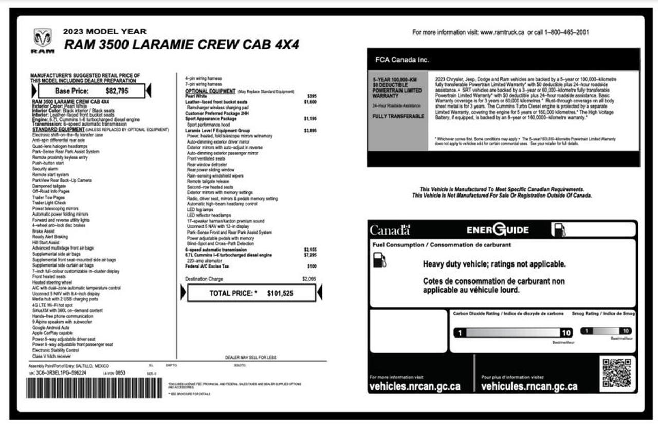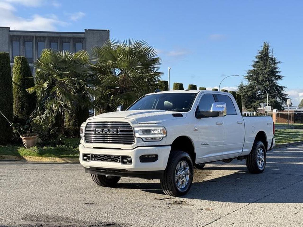 This 2023 Ram 3500 Laramie Sport 4x4 crew cab is powered by a 6.7L Cummins inline-6 turbo diesel paired with a 6-speed automatic transmission and features an electronic shift-on-the-fly transfer case with anti-spin rear differential. It is equipped with a 6.3-foot box, Class V hitch with 4- and 7-pin wiring, trailer tow pages, trailer light check, and power telescoping and folding mirrors with forward and reverse utility lighting. The interior offers leather seating with heated and ventilated front seats, heated steering wheel, dual-zone automatic climate control, power adjustable pedals with memory, and a 12-inch Uconnect 5 NAV system with Apple CarPlay and Android Auto, along with a 17-speaker Harman/Kardon premium sound system. Additional features include Park-Sense front and rear park assist, ParkView backup camera, blind-spot and cross-path detection, remote start, push-button start, rain-sensing wipers, LED lighting, sport performance hood, and a power sliding rear window. Finished in white with a black leather interior, this truck offers a well-equipped and capable setup suited for towing, work, or everyday driving. This item is currently OFFSITE. You must register an appointment with our office to schedule an offsite viewing. Appointments must be made a minimum of one business day in advance (and as defined by the days that Repo.com is open for business) before your appointment can be scheduled and confirmed. We may, at our own discretion, instead opt to transport smaller items to Repo.com's main yard for viewing purposes. $79,990.00 plus $375 processing fee, $80,365.00 total payment obligation before taxes. Listing report, warranty, contract commitment cancellation fee, financing available on approved credit (some limitations and exceptions may apply). All above specifications and information is considered to be accurate but is not guaranteed and no opinion or advice is given as to whether this item should be purchased. We do not allow test drives due to theft, fraud, acts of vandalism and undetectable impaired driving. Instead we provide the following benefits: Complimentary Warranty (with options to extend), Limited Money Back Satisfaction Guarantee on Fully Completed Contracts, Contract Commitment Cancellation, and an Open-Ended Sell-Back Option. Ask seller for details or call 604-522-REPO(7376) to confirm listing availability.