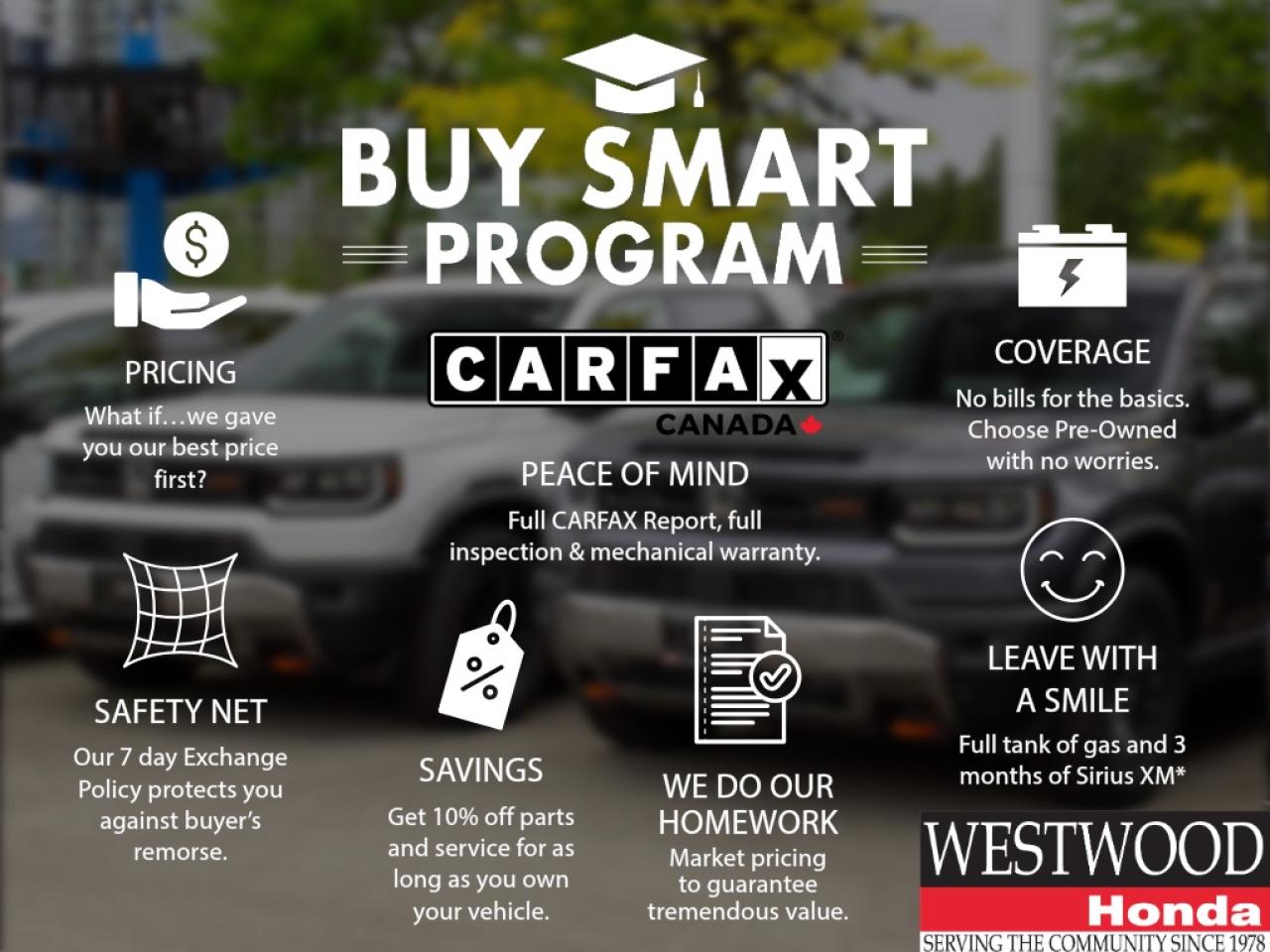 Add $795 Dealer Fee. Includes Buysmart Registration. Plus taxes and Govt. Levies.One low hassle free pre negotiated price, Air Conditioning, Brake assist, Electronic Stability Control, Heated Front Bucket Seats, Lane Departure Warning System, Memory seat, Navigation System, Power driver seat.We specialize in getting you into vehicles with 0 emissions, We have been the largest retailer in Canada of used EV's over the last 10 years . HOV lane access and a fraction of gas-vehicle maintenance costs. Looking for a specific model that's not in our inventory? Our sourcing experts will find one for you. Westwood Hondas EV sales last year will keep approximately 600,000 metric tons of carbon dioxide out of the atmosphere over the next 4 years. Join the Revolution, save the planet, AND save money. Westwood Honda's Buy Smart Standard program includes a thorough safety inspection, detailed Car Proof report that shows the history of the car youre buying, a 6-month warranty on tires, brakes, and bulbs, and 3 free months of Sirius radio where equipped! . We give you a complete professional detail, a full charge, our best low price first based on live market pricing, to guarantee you tremendous value and a non-stressful, no-haggle experience. Buy your car from home.Just click build your deal to start the process. It is easy 7 day Exchange Policy! Westwood Honda DL #31286.