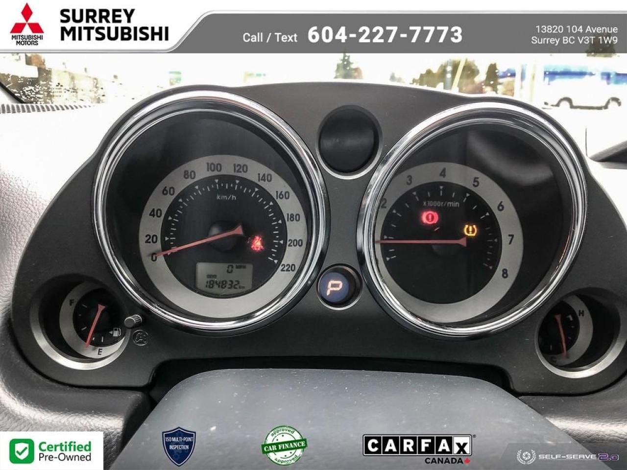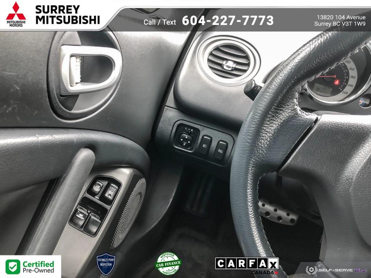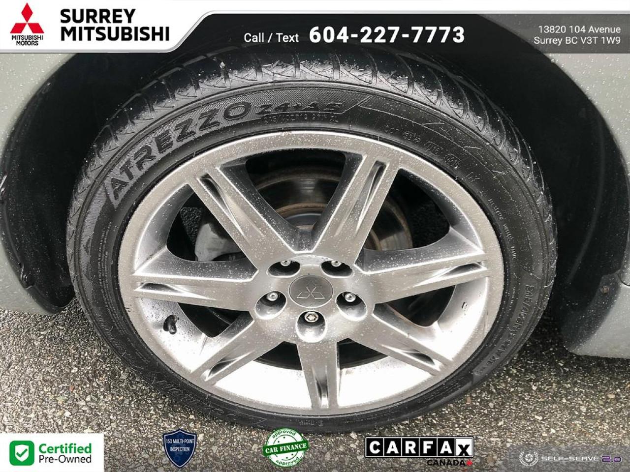 At Surrey Mitsubishi all vehicles are inspected by factory trained technicians, professionally detailed, and come with Carfax report and lien report.Shop with confidence at Surrey Mitsubishi and see why we are greater Vancouver's number one car superstore! We take all trades and offer financing for everyone! All prices are plus $695 prep fee, $159 wheel lock fee, $395 doc fee, $1495 finance fee or $695 Cash Admin Fee . All credit is cod. See Dealer for details.