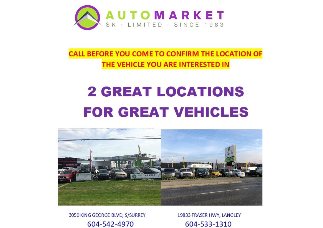This vehicle has been Fully Inspected, Certified and Qualifies for Our Free Extended Warranty.Don't forget to ask about our Great Finance and Lease Rates. We also have a Options for Buy Here Pay Here and Lease to Own for Good Customers in Bad Situations. 2 locations to help you, White Rock and Langley. Be sure to call before you come to confirm the vehicles location and availability or look us up at www.automarketsales.com. White Rock 604-542-4970 and Langley 604-533-1310. Serving Surrey, Delta, Langley, Richmond, Vancouver, all of BC and western Canada. Financing & leasing available. CALL SK AUTOMARKET LTD. 6045424970. Call us toll-free at 1 877 813-6807. $999 Documentation fee (negotiable) and applicable taxes are in addition to advertised prices. LANGLEY LOCATION DEALER# 40038 S. SURREY LOCATION DEALER #9987