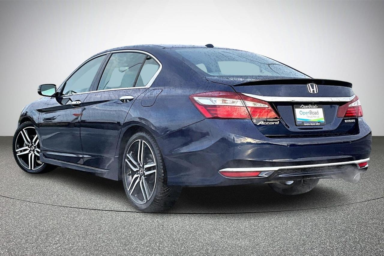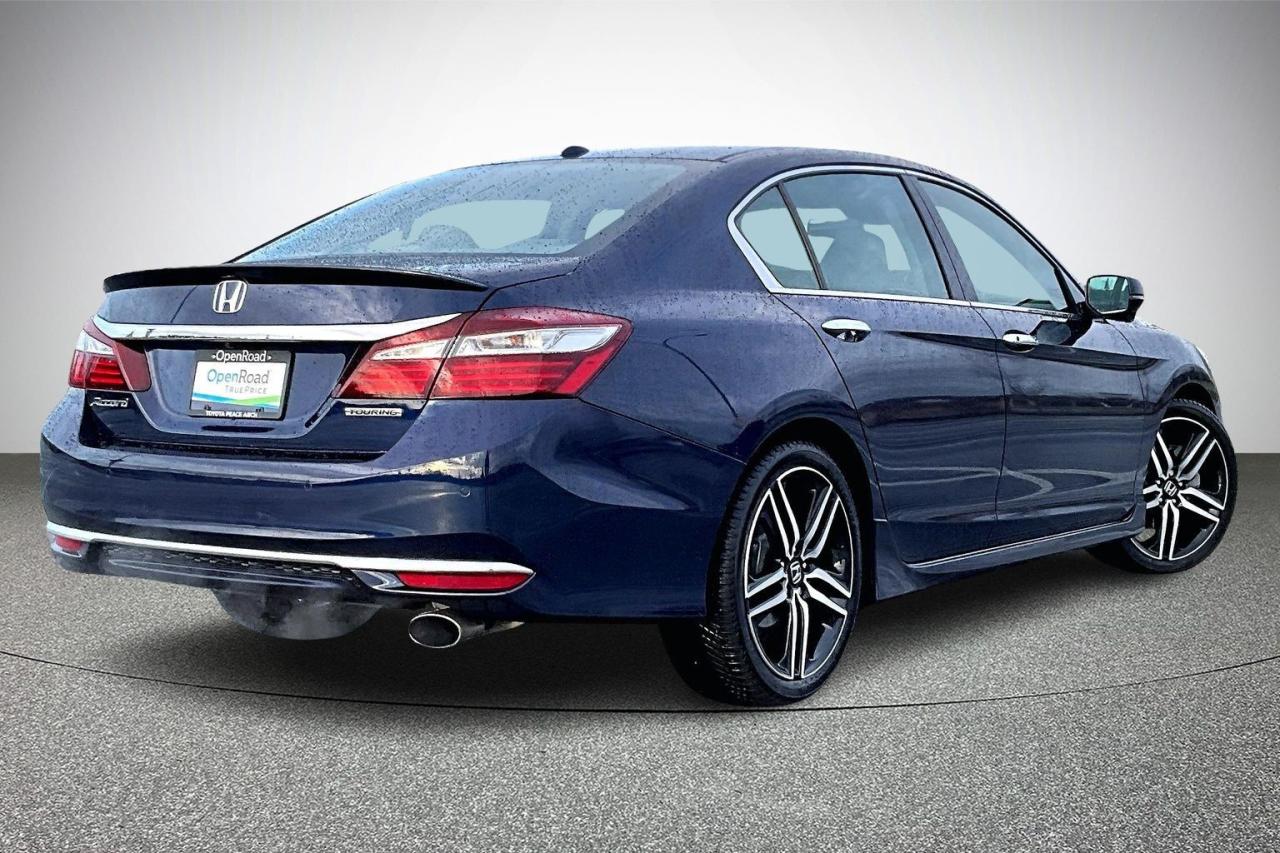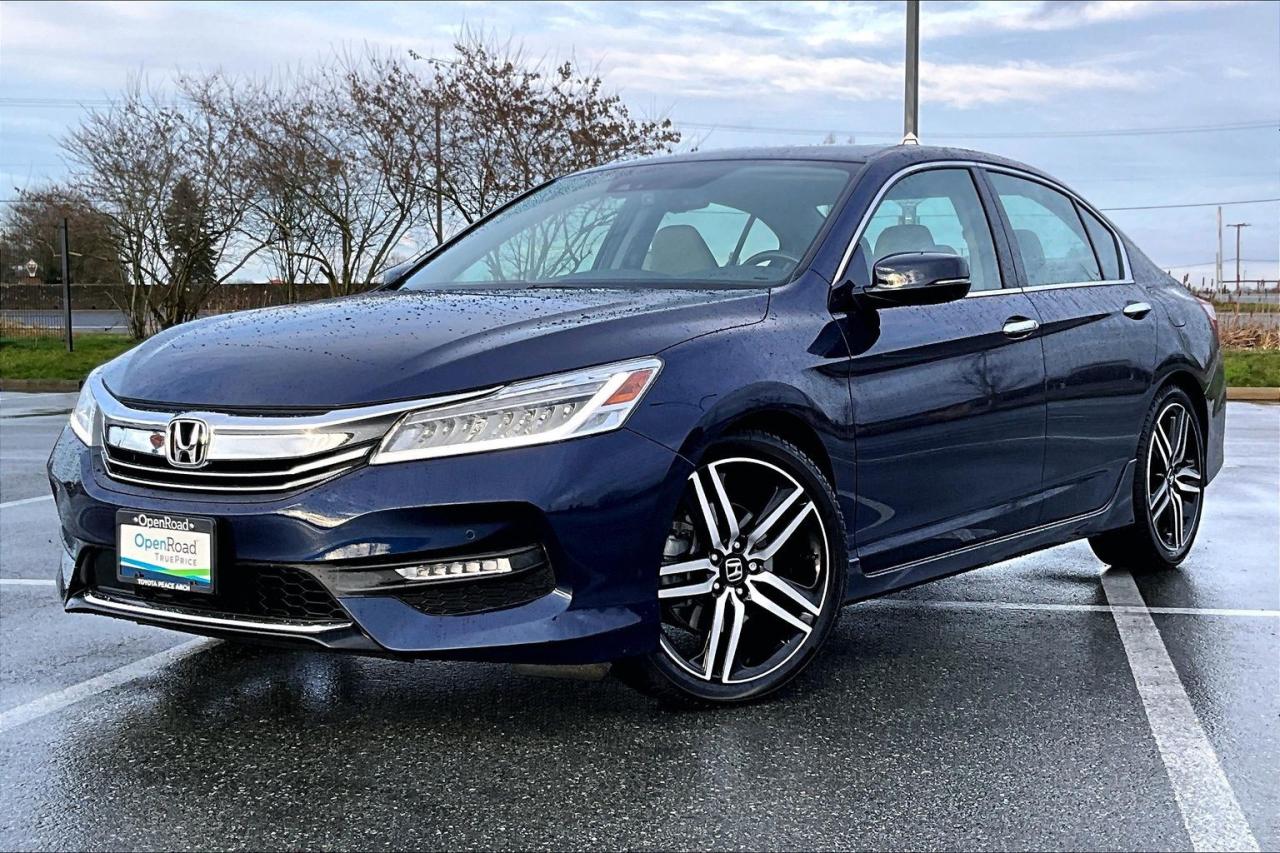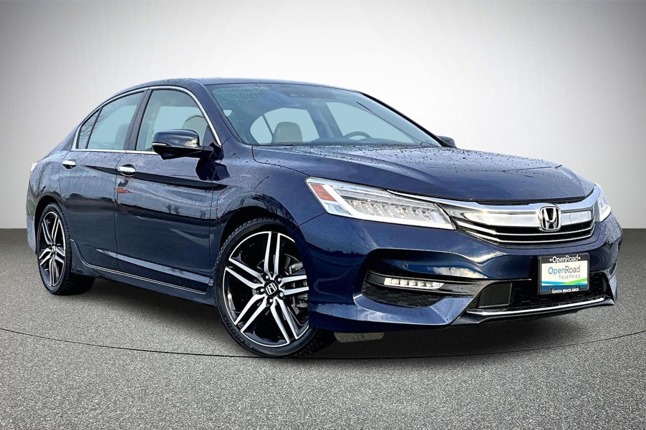 The 2017 Honda Accord Sedan L4 Touring with CVT combines comfort, technology and efficiency in a premium midsize package. It is powered by a 2.4-litre, direct-injected i-VTEC four-cylinder with a smooth continuously variable transmission and ECON mode for better fuel economy. Touring trim adds leather upholstery, heated front and rear seats, a one-touch power moonroof, dual-zone climate control and a 360-watt premium audio system. Standard tech includes an integrated navigation system, wireless charging, multi-angle rearview camera, Bluetooth and smartphone integration. Safety and convenience are enhanced by Honda Sensing features, rain-sensing wipers, auto high-beams and front/rear parking sensors. Have confidence with your OpenRoad purchase! Every OpenRoad Certified Pre-Owned vehicle comes fully reconditioned and complete with a comprehensive 153 point mechanical inspection, a CarFax history & lien report, a 3-Day Money Back Guarantee, a 30-Day/2,000 kms Exchange Policy, a 90-Day/5,000 kms Powertrain Warranty, guaranteed clear title, and membership to our exclusive Club OpenRoad! As a proud member of the OpenRoad Auto Group, a trusted name since 2000 serving the Lower mainland (including White Rock, Surrey, Langley, Maple Ridge, Delta, Richmond, Mission and beyond) with outstanding Toyota vehicles, Toyota parts, and Toyota service since 1966! OpenRoad Toyota Peace Arch is a “True Price” dealer, meaning no inflated prices, and no need for back and forth haggling! We use up to the minute technology offering LIVE MARKET VALUE PRICING to ensure you are receiving the most competitive price possible on all of our Pre-Owned vehicles! All advertised vehicle prices do not include our $599 documentation fee.