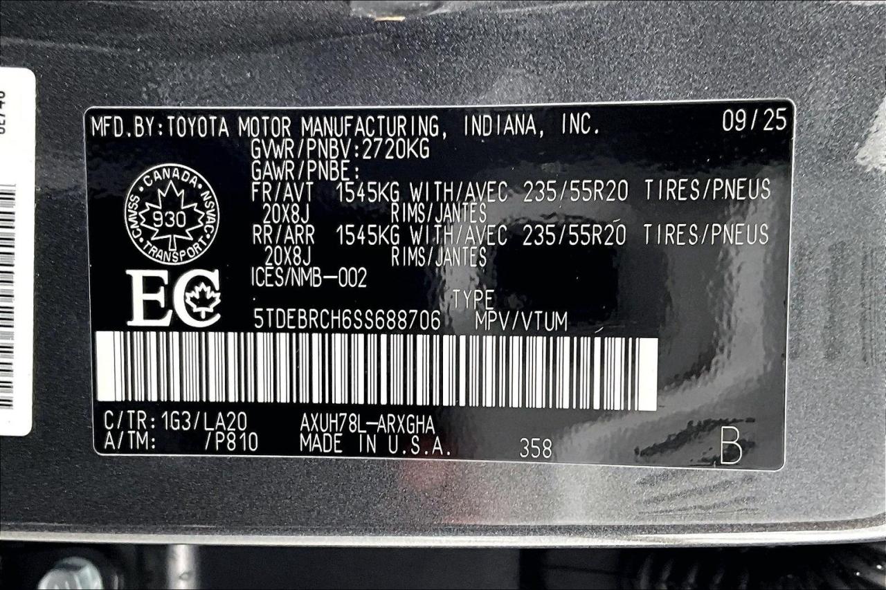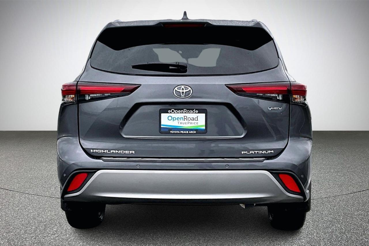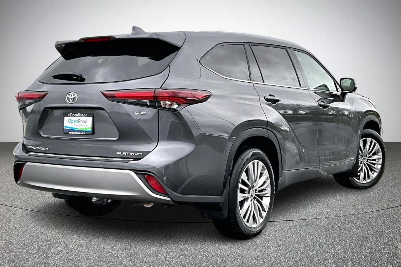 The 2025 Toyota Highlander Hybrid Platinum delivers premium comfort, advanced technology, and impressive efficiency in a refined midsize SUV. Powered by a 2.5-litre hybrid system with electronic AWD, it provides smooth performance and excellent fuel economy. The Platinum trim enhances luxury with exclusive 20-inch alloy wheels, a panoramic moonroof, premium leather seating, and heated second-row captain’s chairs. Advanced features include a head-up display, digital rearview mirror, surround-view camera system, and a large touchscreen infotainment system. Toyota Safety Sense 2.5+ comes standard, offering comprehensive driver-assist technologies for confident, secure driving in all conditions. Have confidence with your OpenRoad purchase! Every OpenRoad Certified Pre-Owned vehicle comes fully reconditioned and complete with a comprehensive 153 point mechanical inspection, a CarFax history & lien report, a 3-Day Money Back Guarantee, a 30-Day/2,000 kms Exchange Policy, a 90-Day/5,000 kms Powertrain Warranty, guaranteed clear title, and membership to our exclusive Club OpenRoad! As a proud member of the OpenRoad Auto Group, a trusted name since 2000 serving the Lower mainland (including White Rock, Surrey, Langley, Maple Ridge, Delta, Richmond, Mission and beyond) with outstanding Toyota vehicles, Toyota parts, and Toyota service since 1966! OpenRoad Toyota Peace Arch is a “True Price” dealer, meaning no inflated prices, and no need for back and forth haggling! We use up to the minute technology offering LIVE MARKET VALUE PRICING to ensure you are receiving the most competitive price possible on all of our Pre-Owned vehicles! All advertised vehicle prices do not include our $599 documentation fee.