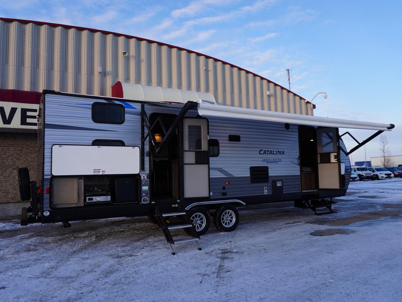 Gorgeous Catalina LEGACY EDITION with Full Outdoor Kitchen and Double Over ‘Double bunk beds,’ yes, and even Dual Entry doors!! Big ‘slide out’ providing a large floor plan, and a very private Queen Bedroom with separate entry. Not only is this a very spacious RV, it arguably has one of the nicest floor plans provided for this size of camper. Exceptional condition inside and out……superb storage throughout and includes a factory Off Grid Solar Package!!