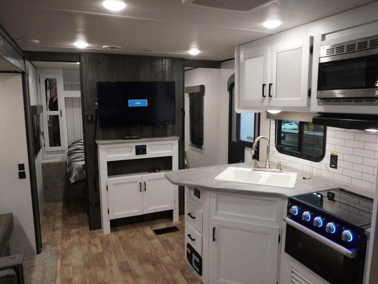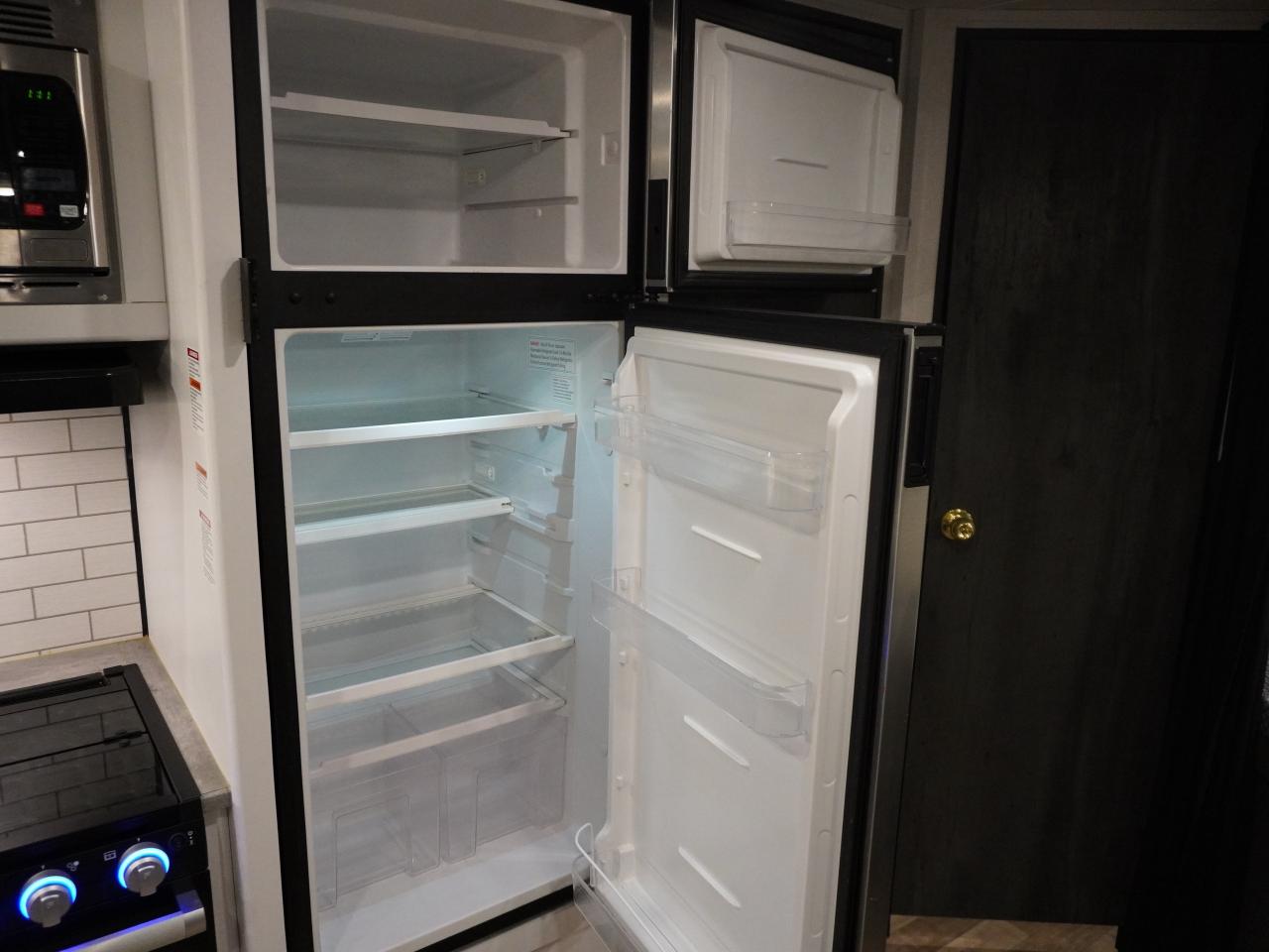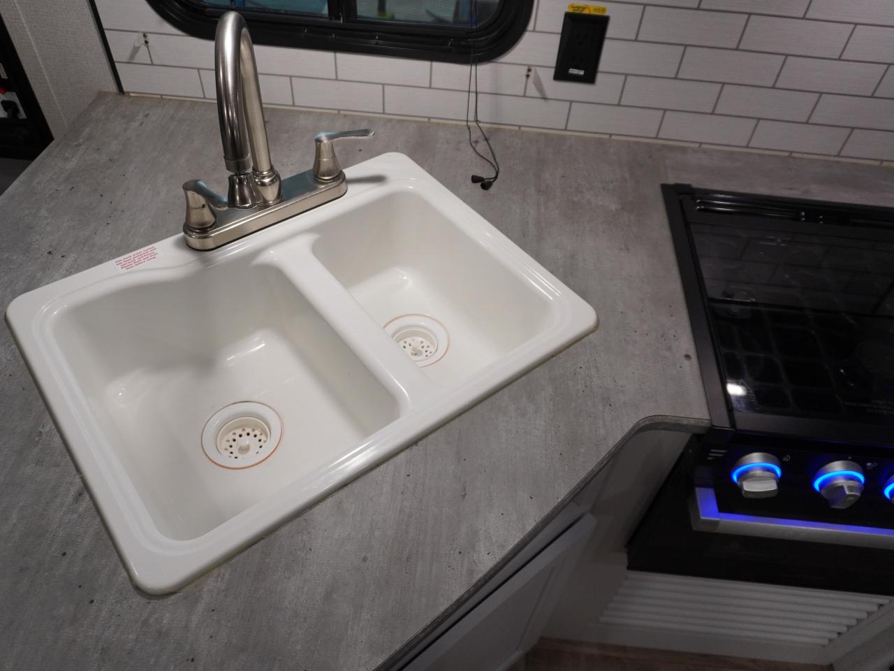 Chef’s Kitchen – Oversized double sink, 3-burner range with oven, microwave, large fridge/freezer, and a huge pantry for all your camping essentials.