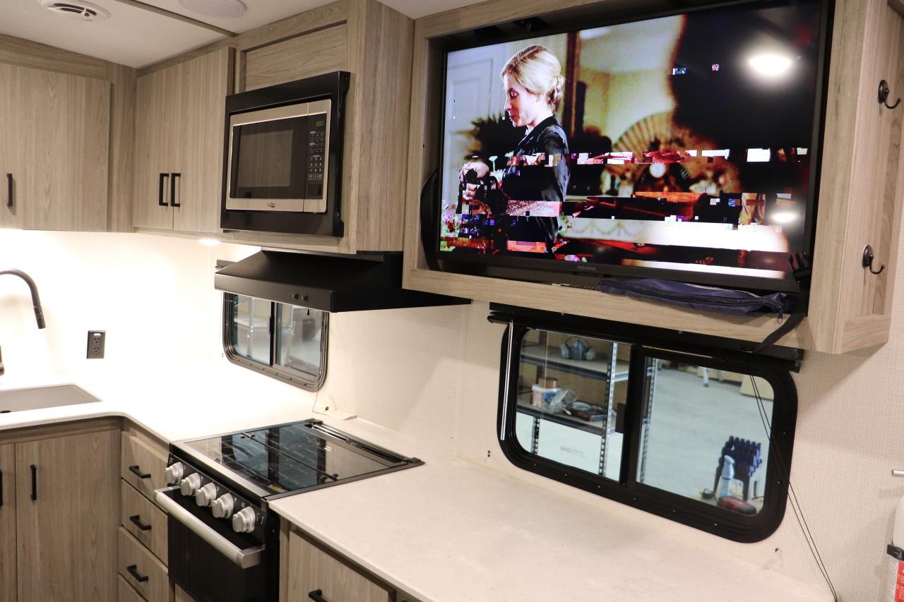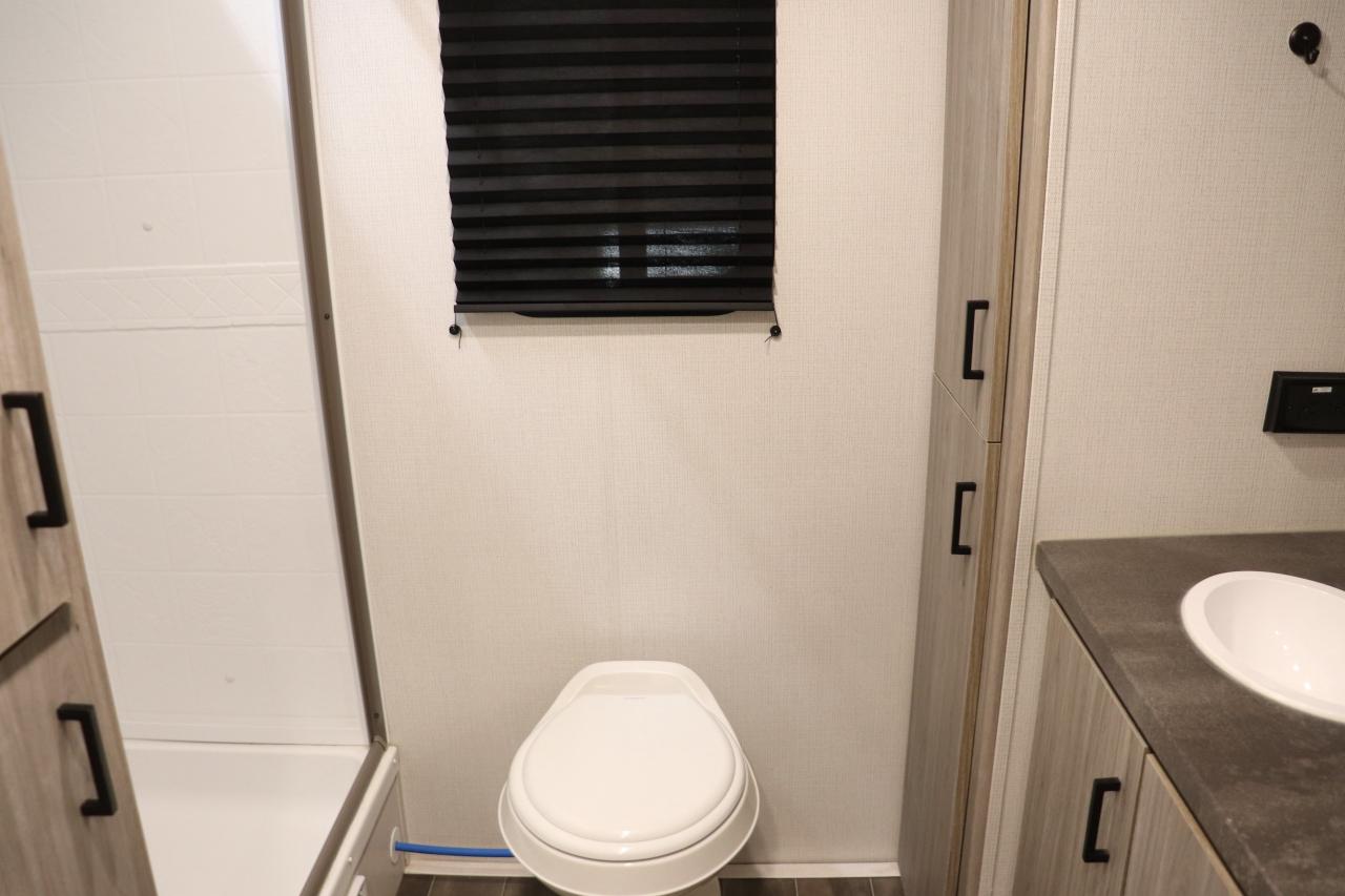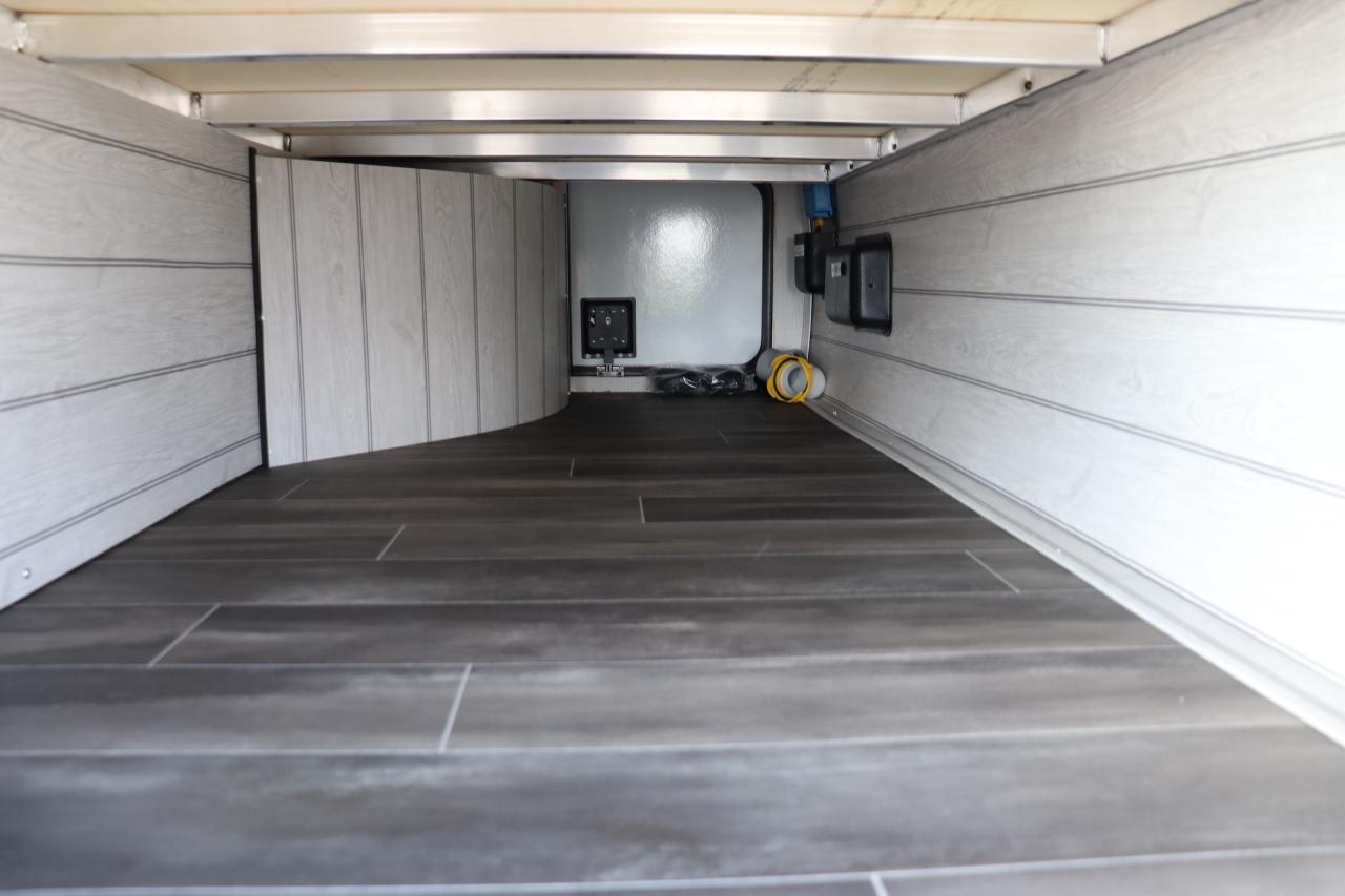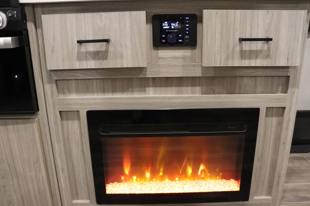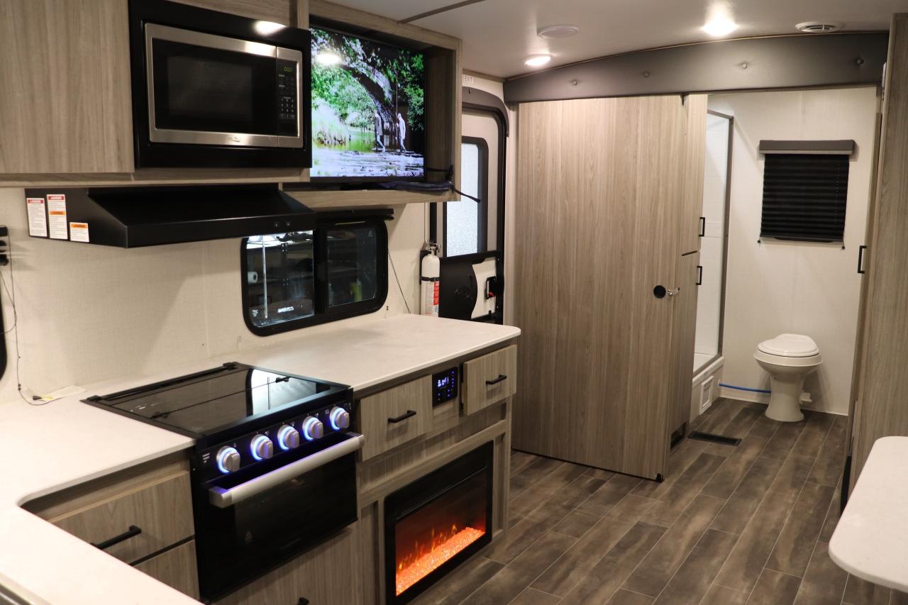 This Passport is more like a modern second home on wheels than a camper. After a day of hiking or biking, relax in the spacious living area, enjoy the warmth of the fireplace, or cook a meal inside or outside. The large rear bath with dual sinks is a rare find in this class of trailer.