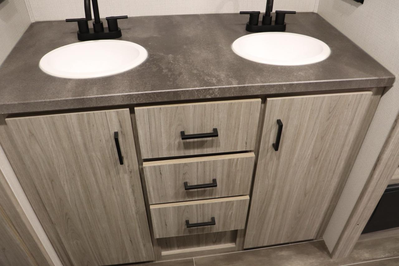 •	Full rear bathroom with dual vanity sinks