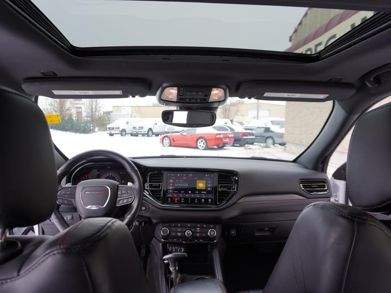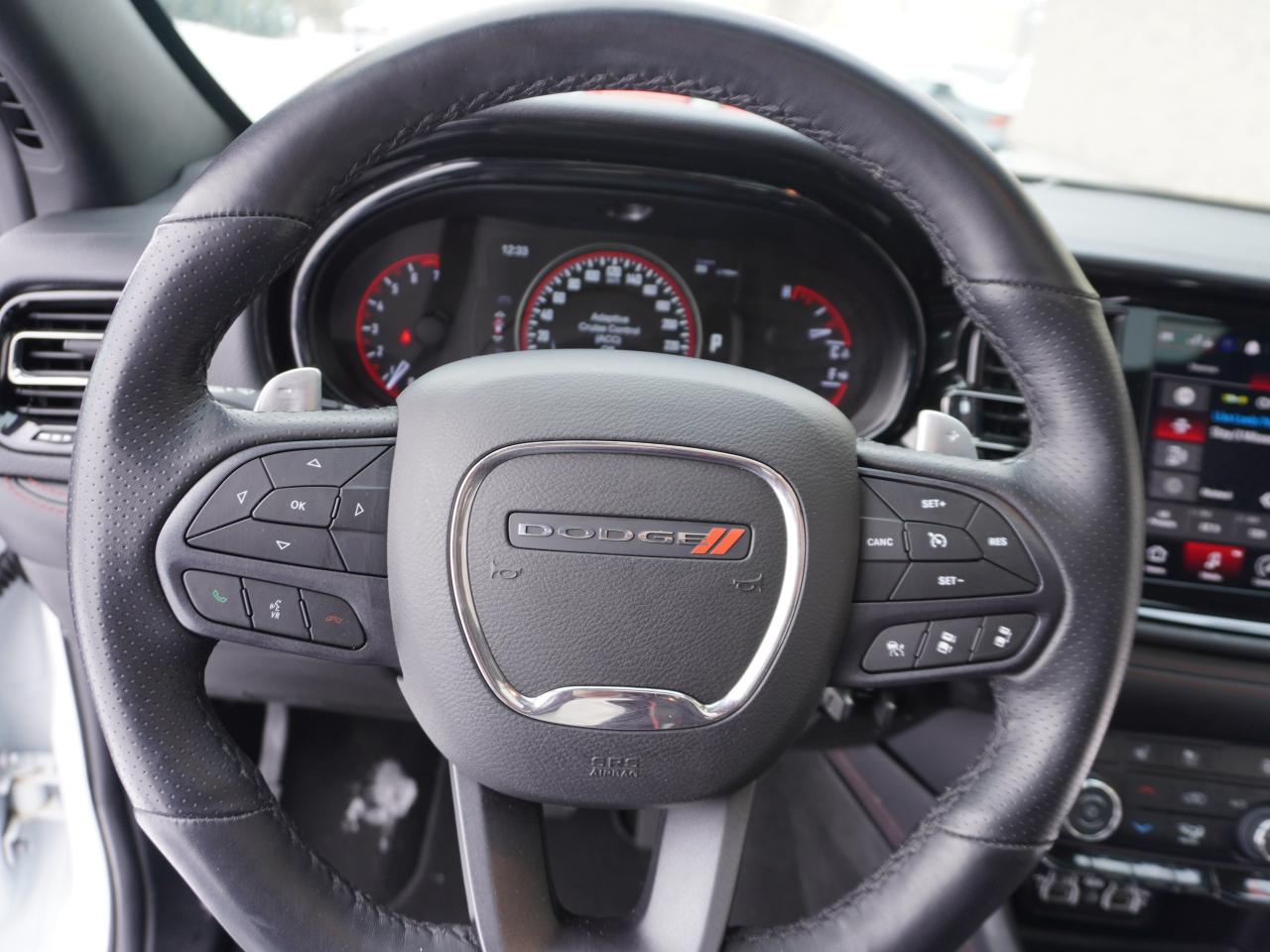 SPORT MEETS LUXURY AND FUNCTIONALITY IN THIS 7 PASSENGER 2023 DODGE DURANGO GT AWD, LOADED INCLUDING SUNROOF, HEATED SEATS FRONT AND REAR AND HEATED STEERING WHEEL! GREAT LOOKS IN BRIGHT WHITE KNUCKLE ON BLACK LEATHER, VERY CLEAN INSIDE AND OUT! This beauty gets power and performance from the proven 3.6L Pentastar V6 engine delivering 295 hp matched to the smooth shifting 8-speed sport-shift automatic, smart auto 4X4 (AWD). This GT is loaded with top of line luxury options like key-less Bluetooth entry with push button start, power lift gate, tri-zone automatic climate control with rear air and heat, heated power memory Sport leather Bucket front seats, heated second row, and with third row (true 7-passenger seating), heated steering wheel, 8-way power adjustable front seats, 2 way power sunroof, tilt and telescopic wheel, Uconnect5 with 10.1-inch touchscreen infotainment system with AUX, USB and satellite, Bluetooth for phone and media, Apple Car Play and Android Auto, factory navigation sys, factory remote start, electronic stability control with hill decent and anti-roll assist, dark privacy glass, GT Appearance package (with body coloured body accents, handles, mirrors and trim), Factory tow package including back up camera, engine cooling and trailer sway control. All this rides on 20" Sport aluminum alloy wheels and so much more. Very clean inside and out with great financing terms available now!!
