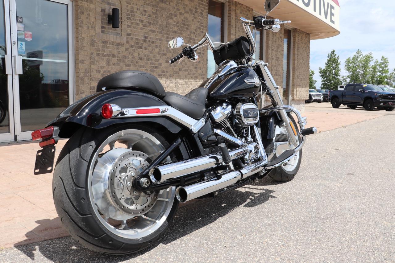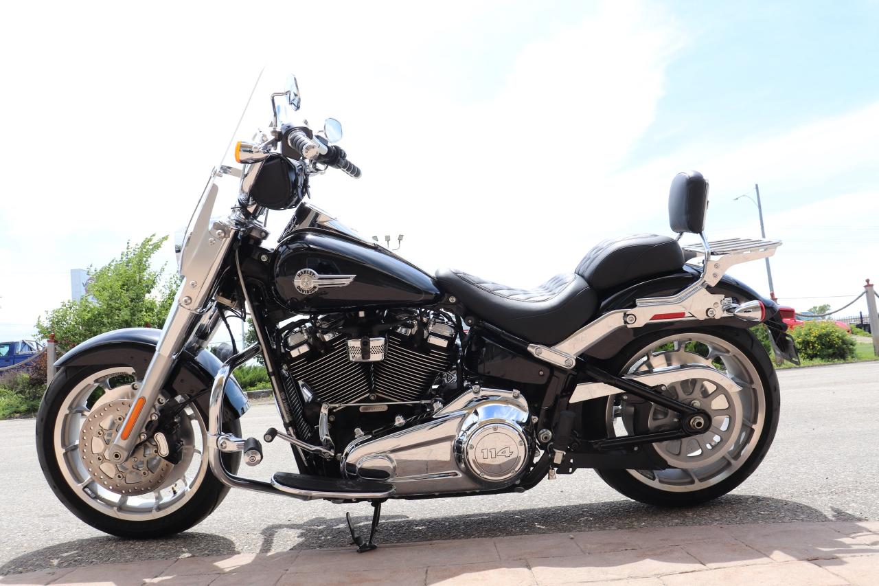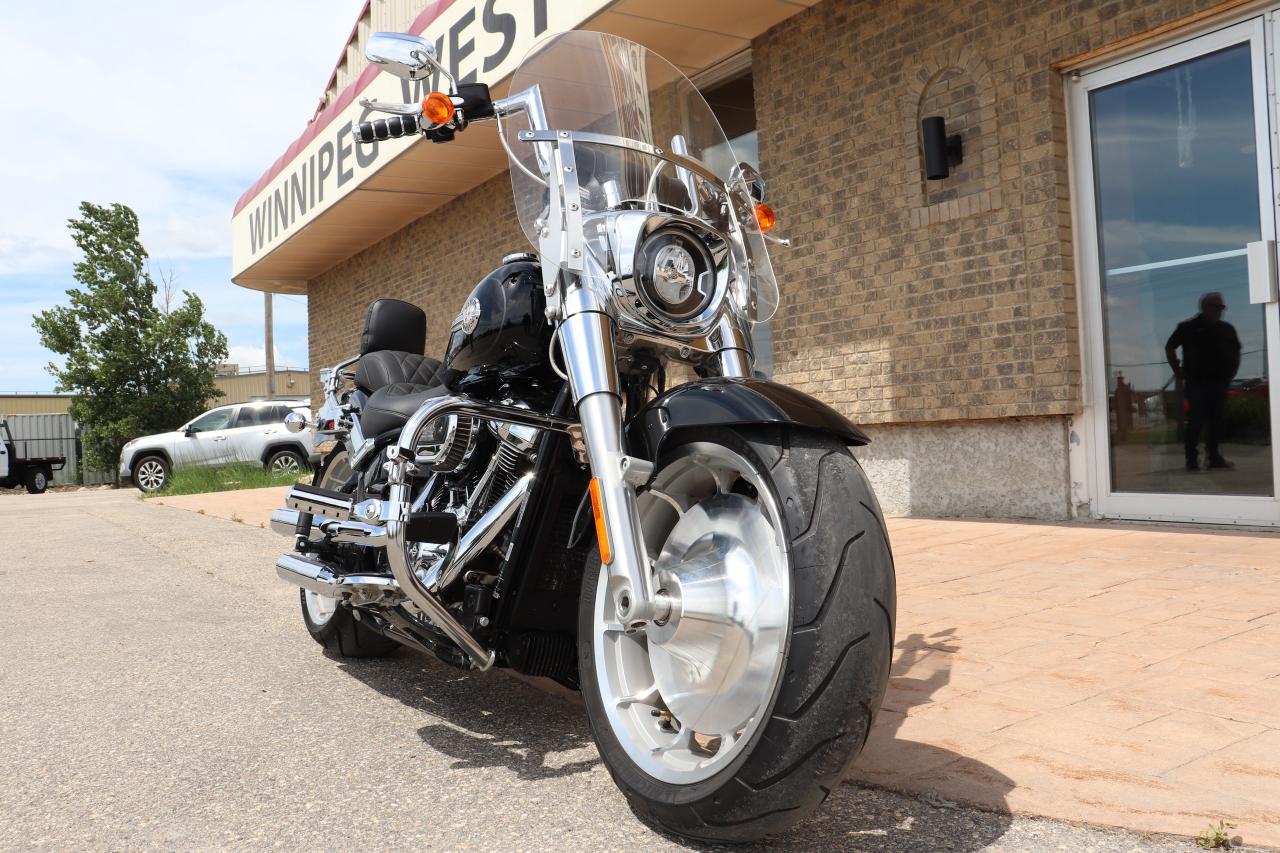 WOW WHAT A BEAUTY! Come check out this fully loaded and already setup with all the RIGHT options to make this a true cruiser! Purchased new at Gaslight HD in Morden Mb and babied by a mature rider, this nearly-new 2023 Harley Davidson Fat Boy, boasting a powerful engine 1868cc (114cuin) and a sleek design that turns heads wherever it goes. This beauty has only been gently ridden, with just 11K kilometers on the clock, making it practically brand new, but actually better than new with over $6,000 in extras added to this beautiful machine!! Starting with the Memphis Shades windshield that fits better than a factory HD one, LA Choppers custom 12-inch Fat Bars with Kuryakyn grips, Beautiful and comfortable Mustang Two piece touring seat, Harley factory crash bars with Harley highway pegs for truly relaxed cruising with your feet up, Harley quick detach passenger backrest with luggage rack, to the Vance and Hines exhaust that totally completes this build with not only great looks but functional cruising and comfort if its a local cruise night or a trip to BC and this bike comes with cruise control as well so it is ready for it all! The 2023 Harley-Davidson Fat Boy 114 is a well-regarded cruiser that excels in providing a comfortable and stylish riding experience. It's a solid choice for riders who appreciate its iconic design, appreciate a planted feel on the road, and enjoy long, relaxed rides. It offers plenty of power for cruising and a confident feel in the corners.
