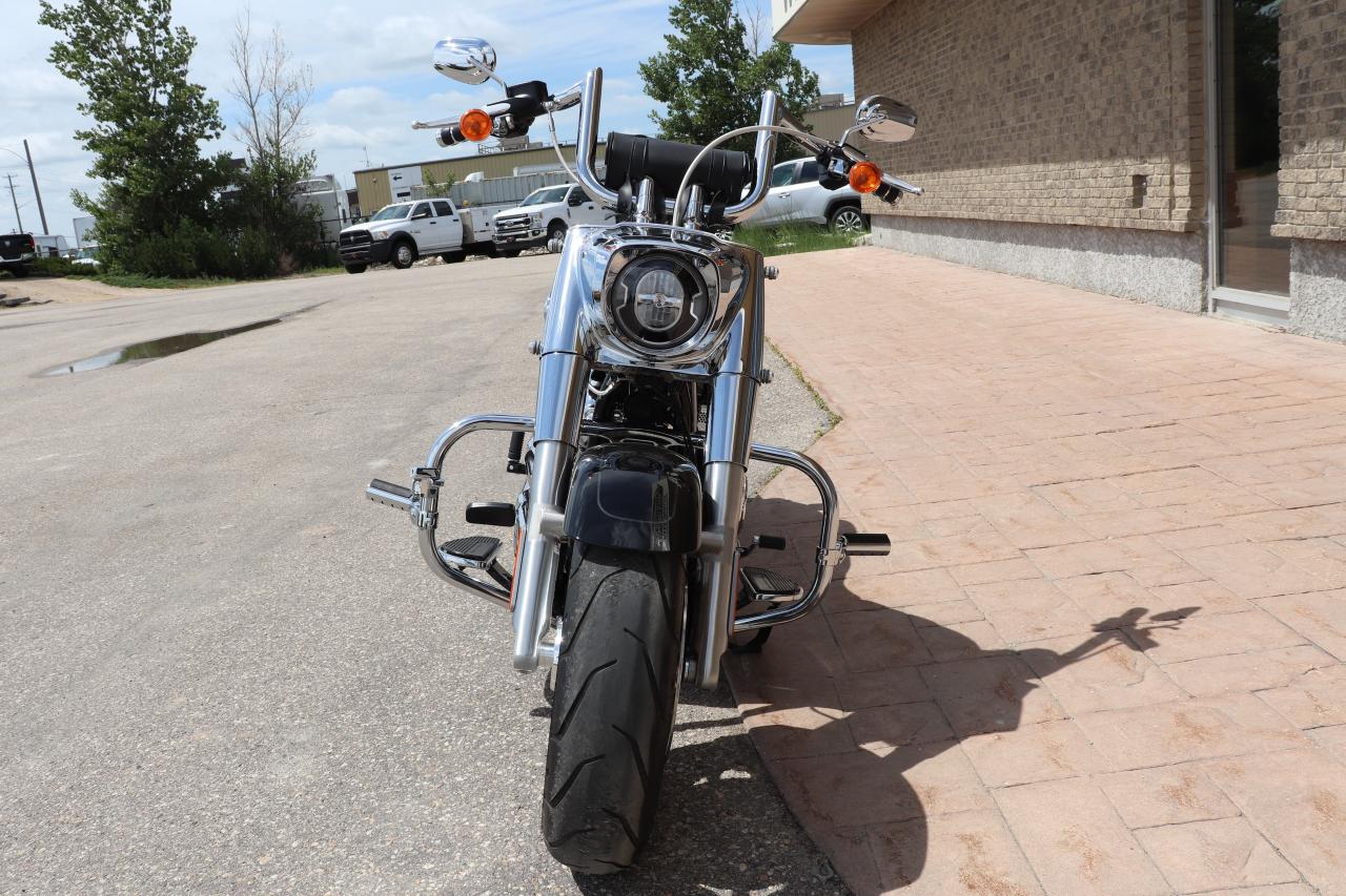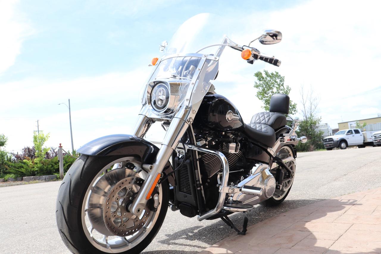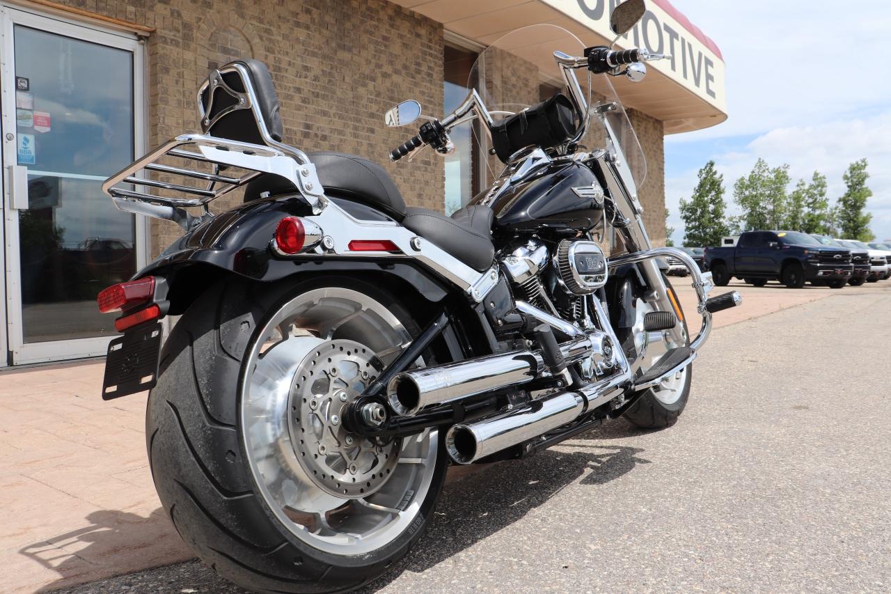 WOW WHAT A BEAUTY! Come check out this fully loaded and already setup with all the RIGHT options to make this a true cruiser! Purchased new at Gaslight HD in Morden Mb and babied by a mature rider, this nearly-new 2023 Harley Davidson Fat Boy, boasting a powerful engine 1868cc (114cuin) and a sleek design that turns heads wherever it goes. This beauty has only been gently ridden, with just 11K kilometers on the clock, making it practically brand new, but actually better than new with over $6,000 in extras added to this beautiful machine!! Starting with the Memphis Shades windshield that fits better than a factory HD one, LA Choppers custom 12-inch Fat Bars with Kuryakyn grips, Beautiful and comfortable Mustang Two piece touring seat, Harley factory crash bars with Harley highway pegs for truly relaxed cruising with your feet up, Harley quick detach passenger backrest with luggage rack, to the Vance and Hines exhaust that totally completes this build with not only great looks but functional cruising and comfort if its a local cruise night or a trip to BC and this bike comes with cruise control as well so it is ready for it all! The 2023 Harley-Davidson Fat Boy 114 is a well-regarded cruiser that excels in providing a comfortable and stylish riding experience. It's a solid choice for riders who appreciate its iconic design, appreciate a planted feel on the road, and enjoy long, relaxed rides. It offers plenty of power for cruising and a confident feel in the corners.