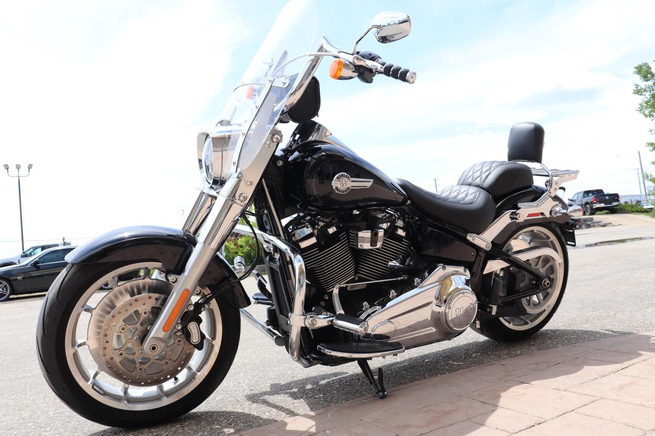 1 LOCAL MANITOBA OWNER WITH A PERFECT HISTORY AND LOW KMS. This 2023 Harley-Davidson Fat Boy 114, is a muscular cruiser with a focus on iconic styling and comfortable riding. It retains its classic look with chrome accents and a low, wide stance, powered by the Milwaukee-Eight 114 engine. The bike offers a planted feel, especially on straight roads, thanks to its fat tires and high-performance front suspension. There has been over $6,000 of custom extras added on to an already beautiful ride!!