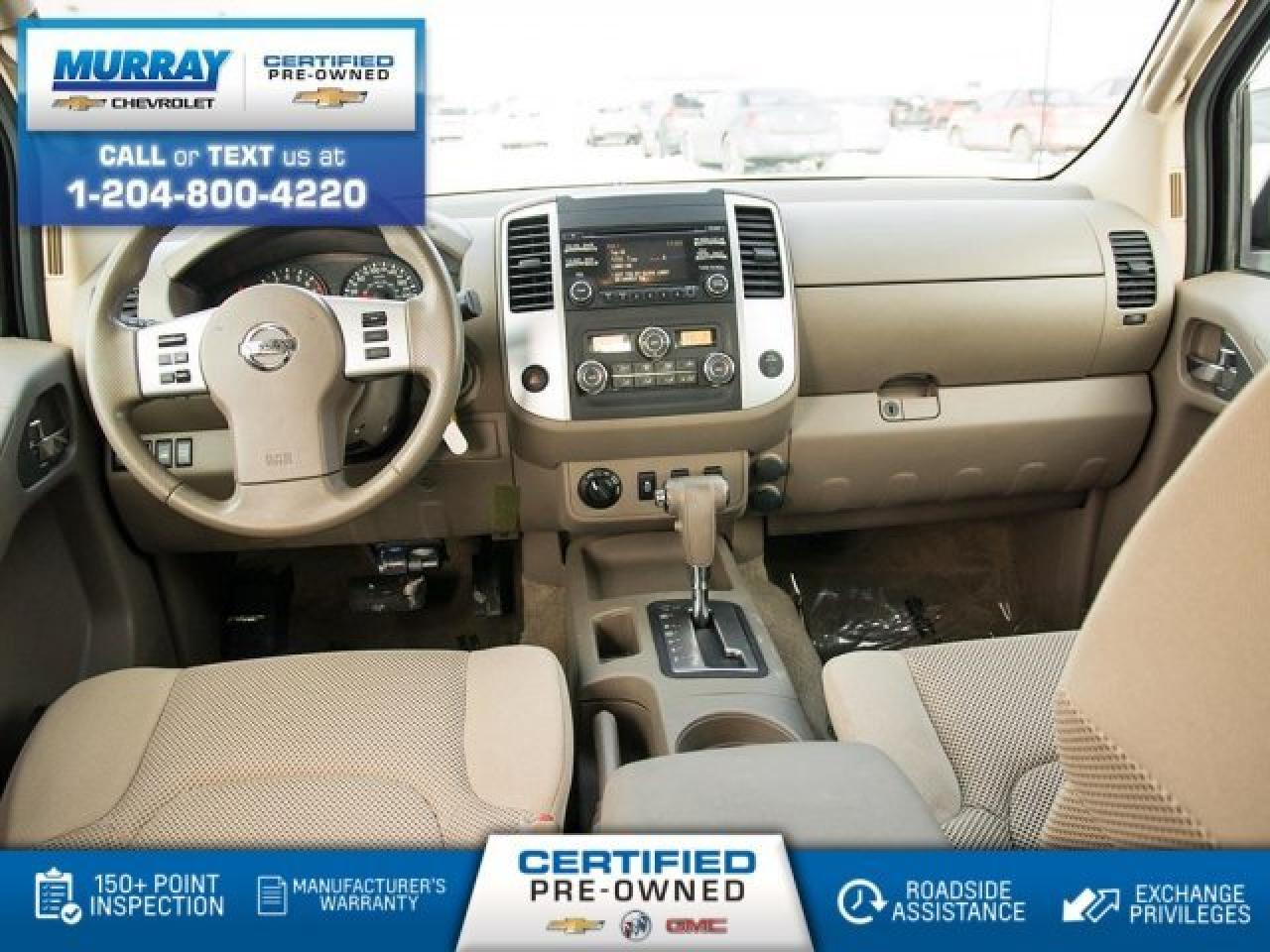 Four Wheel Drive, Crew Cab, Cloth Seats, Keyless Entry, Power Windows/Door Locks Our 2013 Nissan Frontier SV Crew Cab 4X4 is shown proudly in Super Black. Powered by a 4.0 Litre V6 that provides 261hp as needed while mated to a 5 Speed Automatic transmission for smooth shifts and acceleration. This Four Wheel Drive team helps to deliver up to approximately 11.8L/100km on the highway. The great looking aluminum-alloy wheels, locking tailgate, cargo bed light and chrome rear bumper tell you this truck means business. On road or off this Frontier is here to serve up the way to get there and the way home! Take a look inside and you'll find the SV V6 interior was designed to last but also made to be comfortable. Rear doors allow for passengers to gain entry easily but also gives you a large opening for loading cargo. Once inside, you'll find two 12V power outlets, second-row under-seat storage and a fold-flat front passenger seat. Safety is a priority at Nissan, you'll find six airbags 4-wheel anti-lock brakes and vehicle dynamic control all standard. You work hard so now is the time to buy a truck that works even harder for you. Print this page and call us Now... We Know You Will Enjoy Your Test Drive Towards Ownership! View a CarFax Vehicle Report instantly at MurrayChevrolet.ca. : Questions? Call or text us at 204-800-4220 or call us toll-free at 1-888-381-7025.