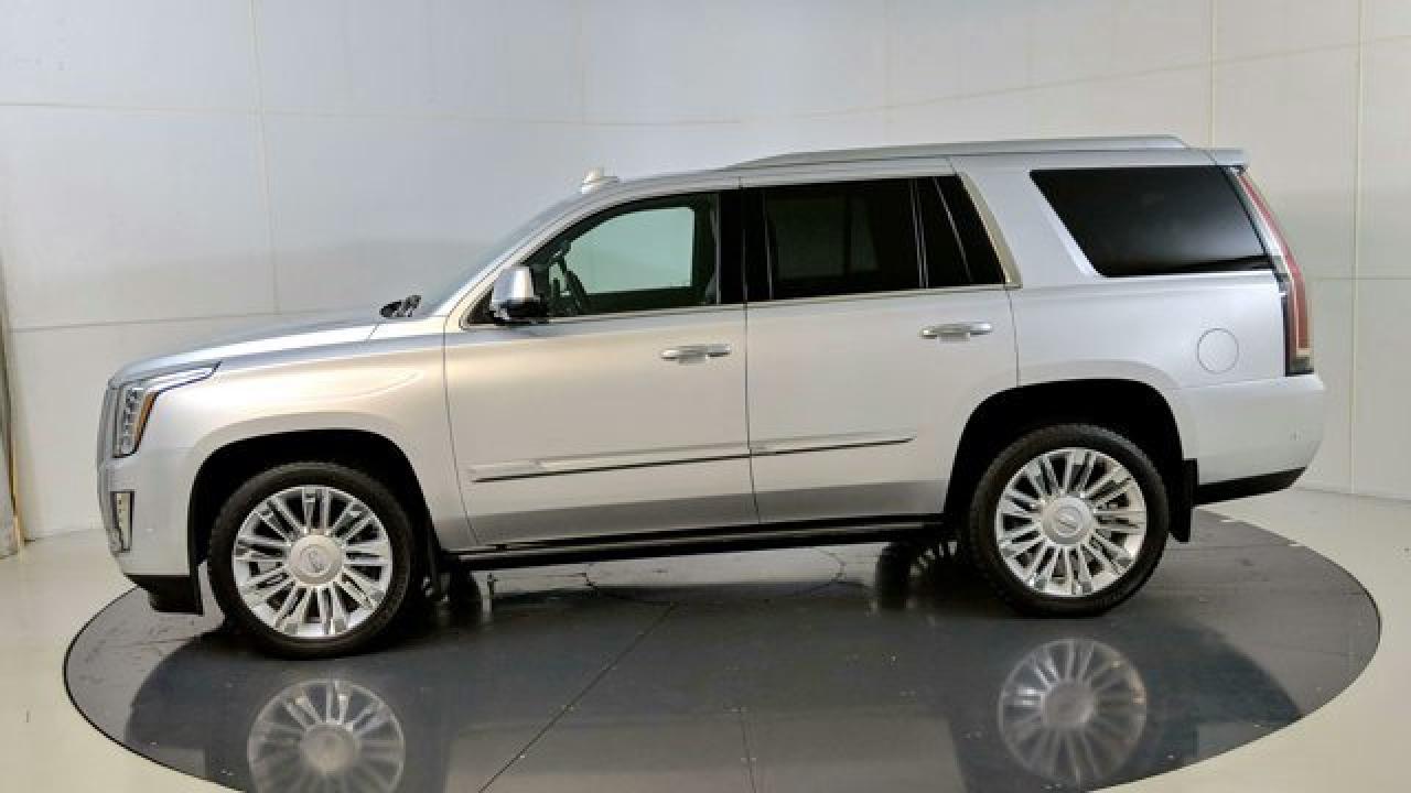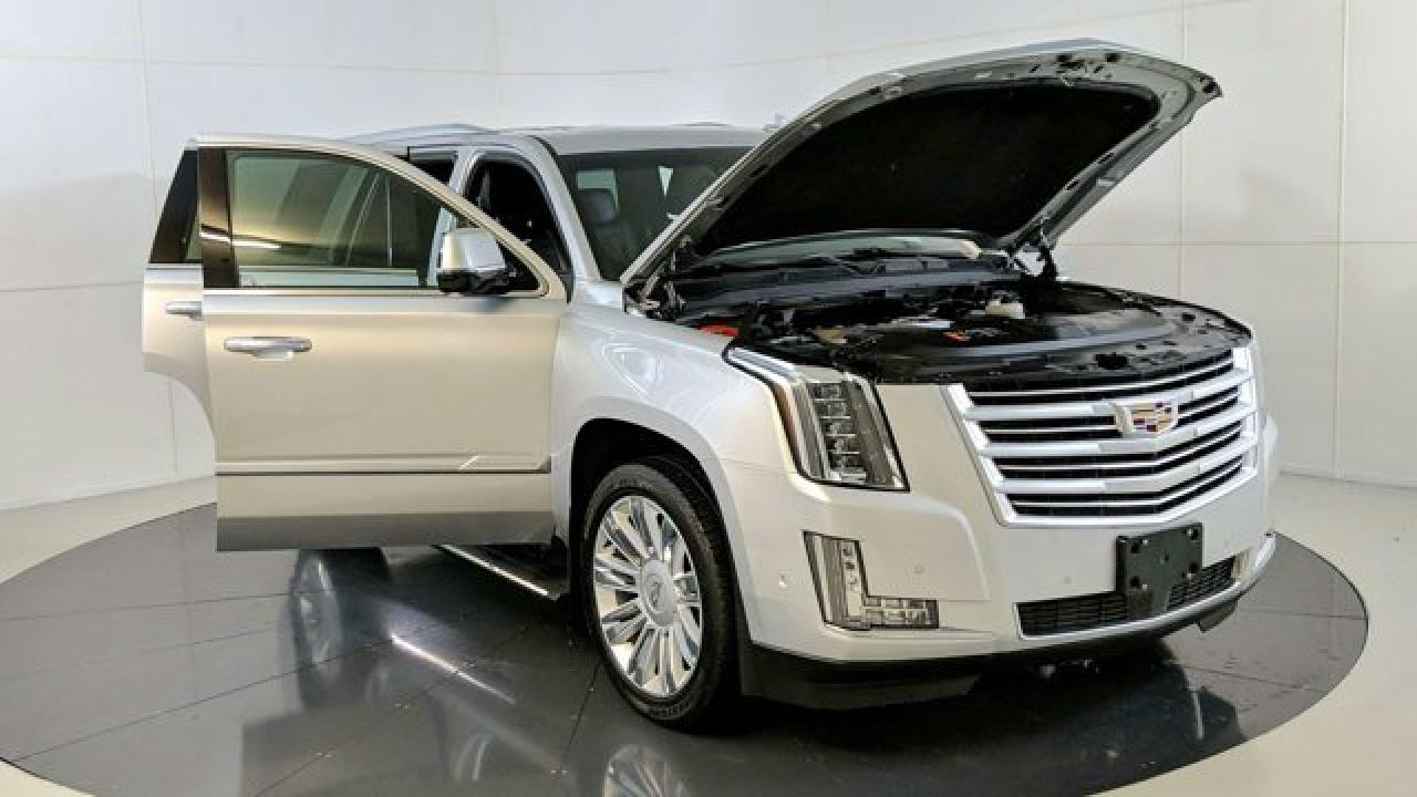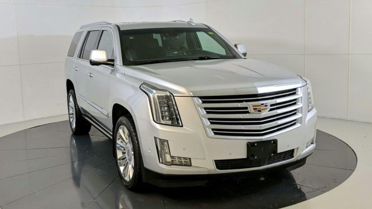 The 2019 Escalade Platinum is powered by a commanding 6.2 L V8 engine delivering 420 hp and 460 lb-ft of torque, paired with a 10-speed automatic transmission and 4WD. Its cabin dazzles with premium features including semi-aniline leather seats with front massage and heating/cooling for first and second rows, a cooled center console cold box, a panoramic sunroof, and a 16-speaker Bose surround sound system complemented by rear-seat DVD screens and built-in Wi-Fi hotspot. On the tech and safety front, the Platinum trim includes adaptive cruise control, lane-departure warning, smart key entry, navigation, Apple CarPlay/Android Auto compatibility, and Cadillac's Magnetic Ride Control suspension for a refined ride experience.