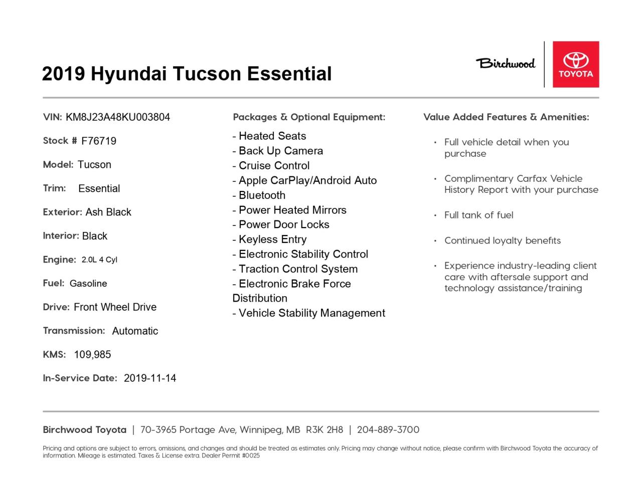 At Birchwood Toyota, we're committed to helping you find the perfect vehicle for your needs. Whether you're interested in taking this Tucson for a test drive or have questions about its features, our team is here to assist you. Visit our website at www.birchwoodtoyota.ca to schedule an appointment or start your purchase journey today. Don't miss out on this fantastic opportunity to own a dependable and stylish SUV!