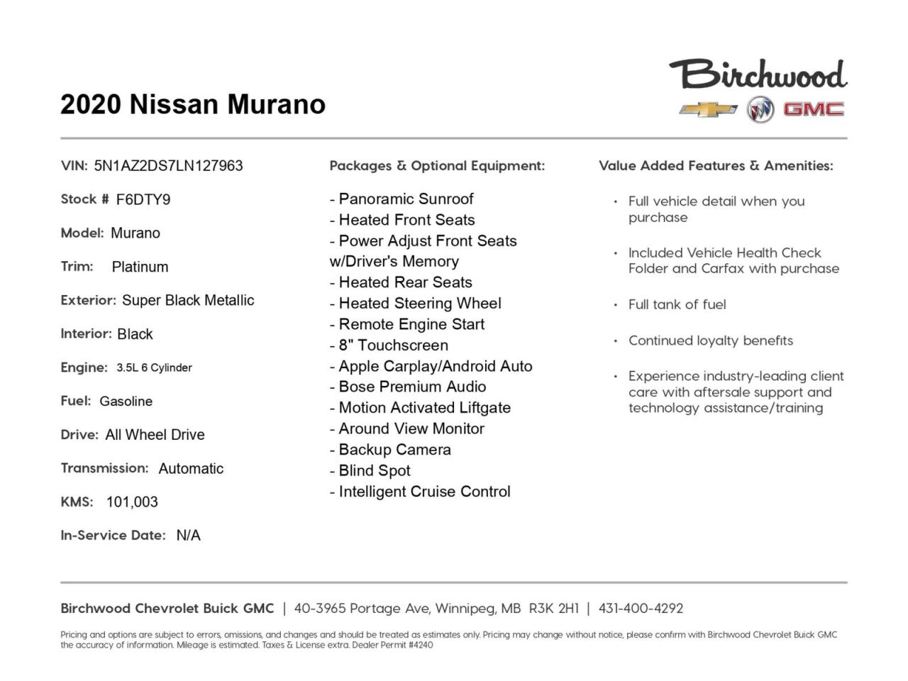 Don't miss this opportunity to own a top-of-the-line Murano. Schedule a test drive today and experience the perfect blend of comfort, technology, and performance. Our knowledgeable staff is ready to answer any questions and guide you through the purchase process. Visit our dealership or contact us online to take the next step in making this exceptional vehicle yours.