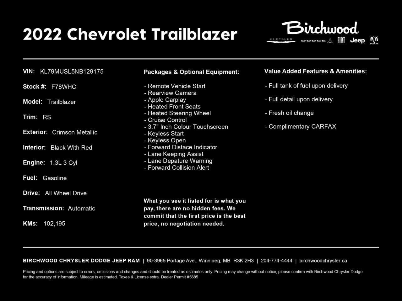 Discover the versatile and stylish 2022 Chevrolet Trailblazer RS AWD, now available at a clearance price! This crimson metallic SUV combines performance, comfort, and advanced technology for the modern adventurer.