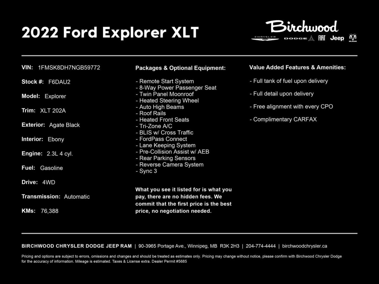 Ready to explore in this Ford Explorer? Visit Birchwood Chrysler Dodge Jeep Ram today to take it for a test drive. Our knowledgeable staff can answer any questions you may have about this impressive SUV. Don't miss out on this opportunity schedule your appointment now or start your purchase online for a seamless buying experience.