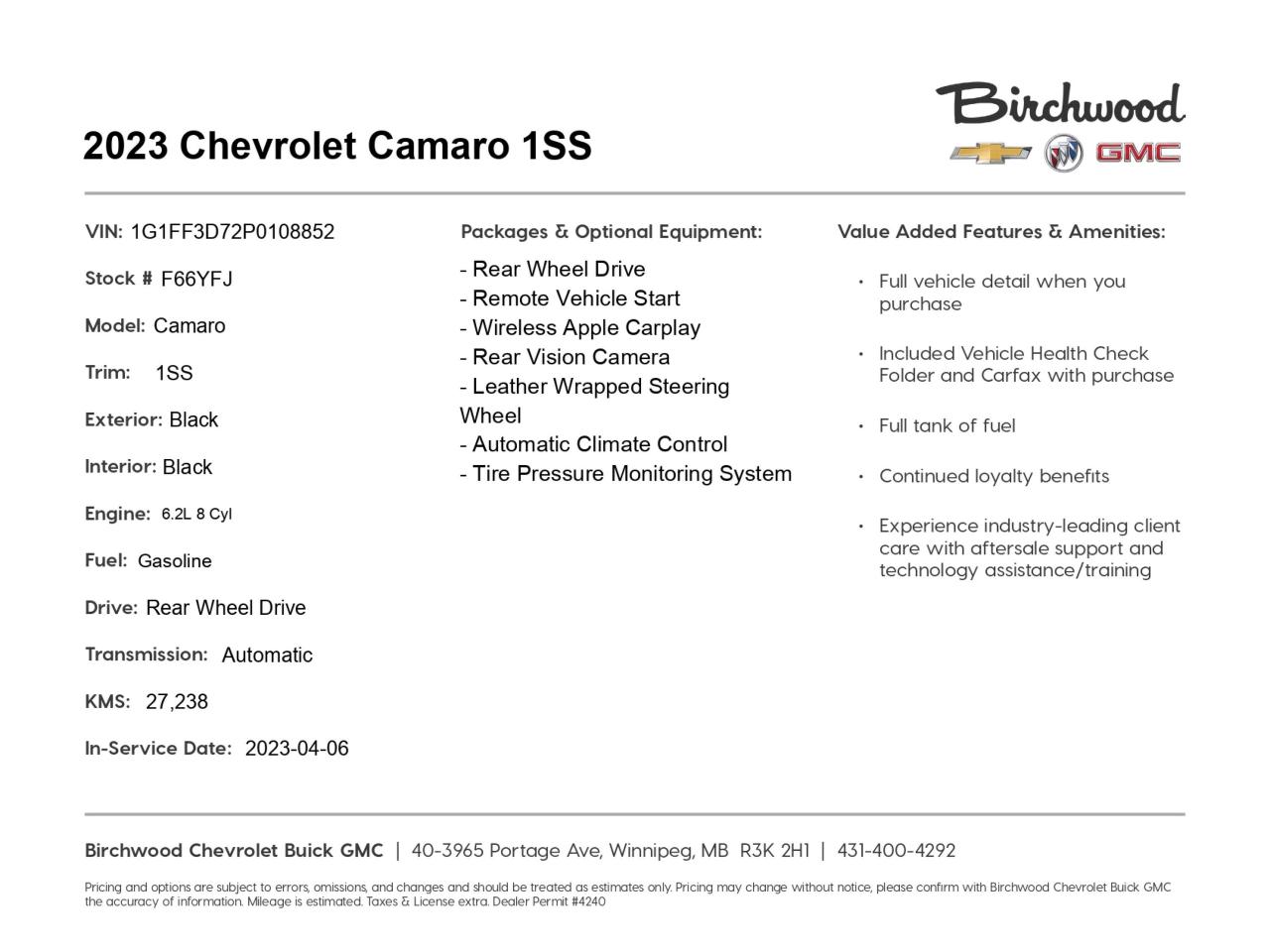 Don't miss this opportunity to own a piece of automotive excellence. Reserve your test drive today and feel the thrill of the Camaro 1SS. Contact Birchwood Chevrolet Buick GMC to start your purchase or for any questions about this exceptional vehicle. Your dream car awaits!
