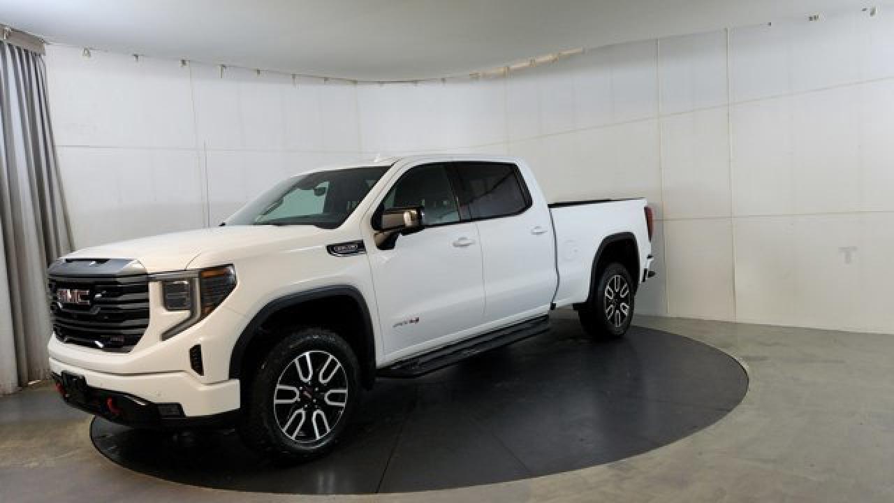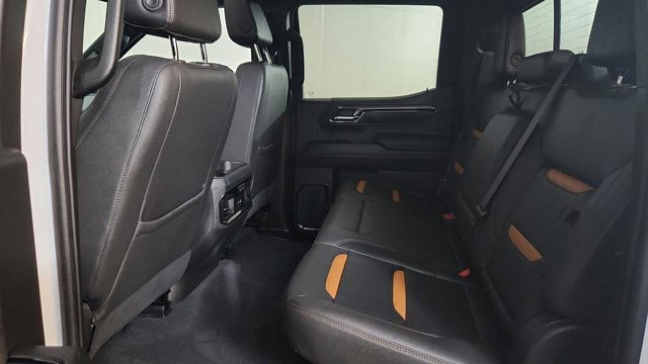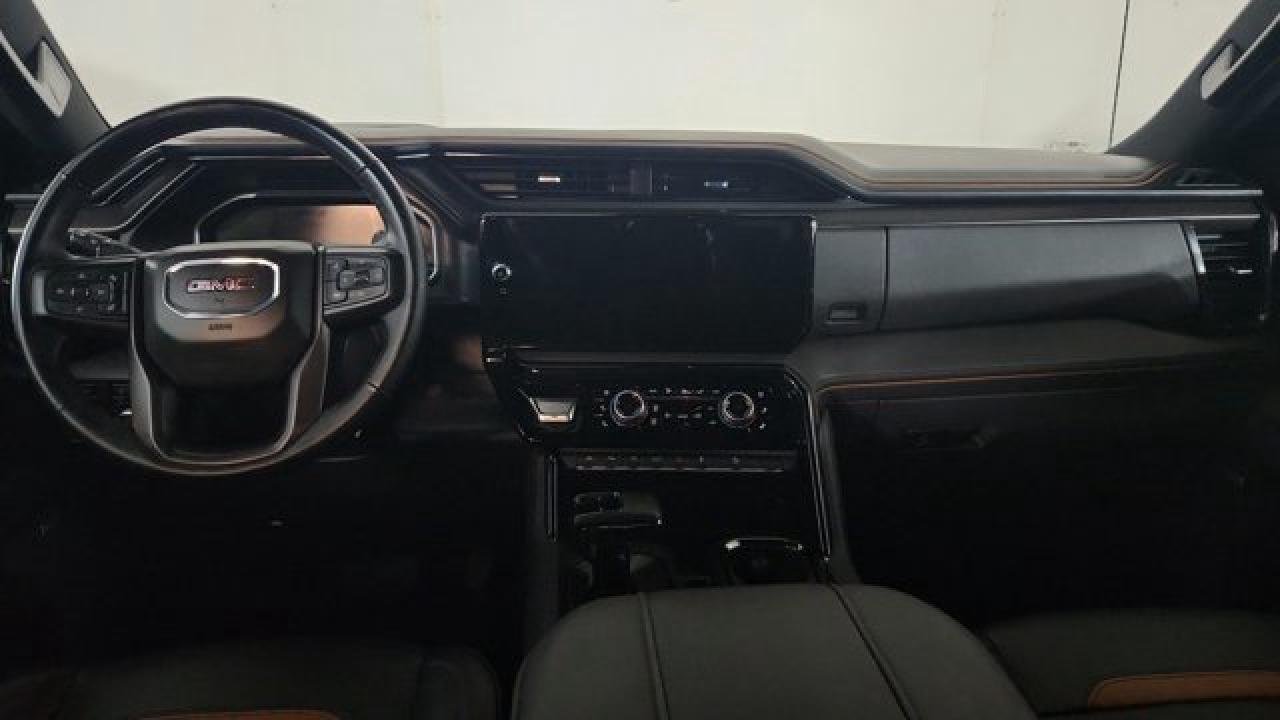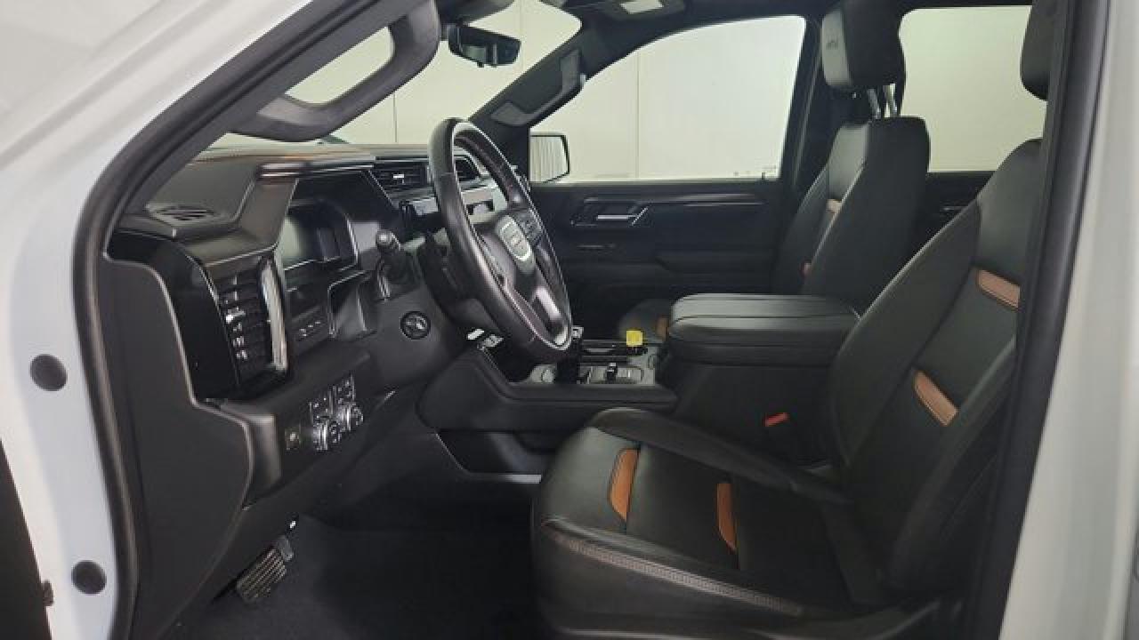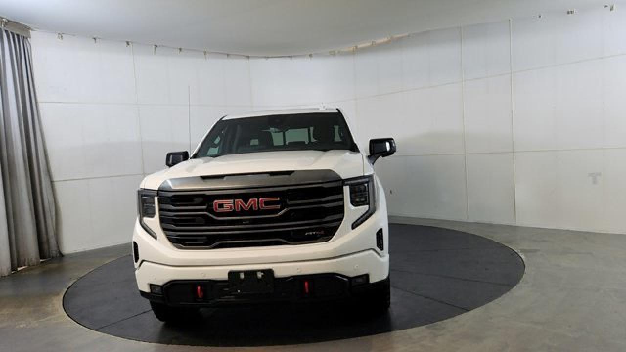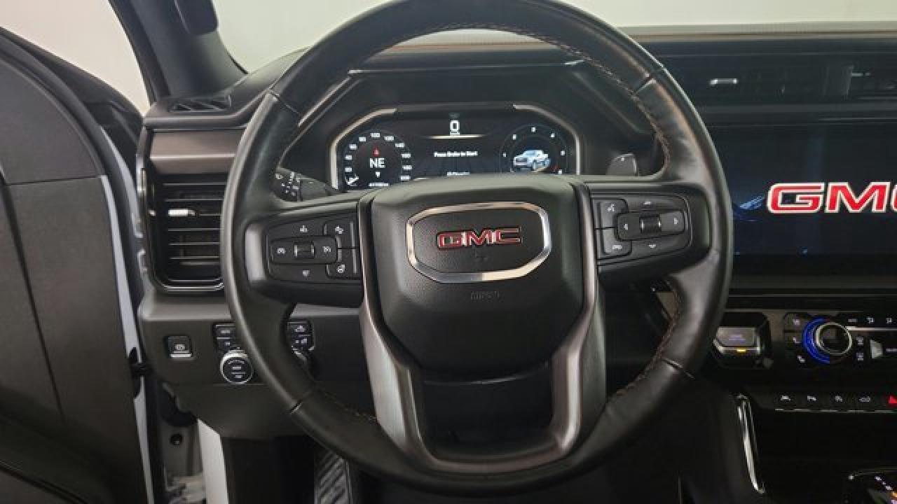The 2023 GMC Sierra 1500 AT4 is a rugged yet refined off-road pickup, featuring a factory-installed 2-inch suspension lift, Rancho monotube shocks, skid plates, and mud-terrain Goodyear Wrangler tires that collectively enhance its capability for rough terrain. It's powered by a 6.2 L V8 gas engine paired with a 10-speed automatic transmission. Inside, the AT4 balances comfort and tech with heated and ventilated Jet Black leather seats with Kalahari accents, a 13.4 touchscreen infotainment system (with available Google built-in), a 12.3 digital driver display (and optional 15 head-up display), as well as GMC Pro Safety features like automatic emergency braking and lane-keep assist.