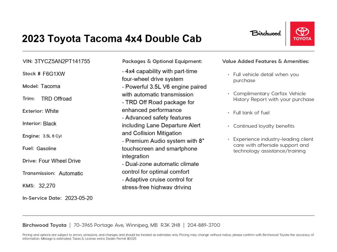 Experience the perfect blend of ruggedness and refinement. Visit Birchwood Toyota today to test drive this exceptional Tacoma. Our team is ready to answer your questions and help you start your purchase journey. Don't miss out on this opportunity to own a barely-broken-in off-road powerhouse!