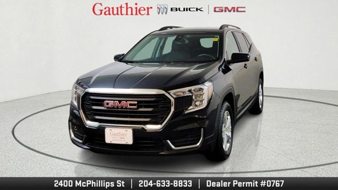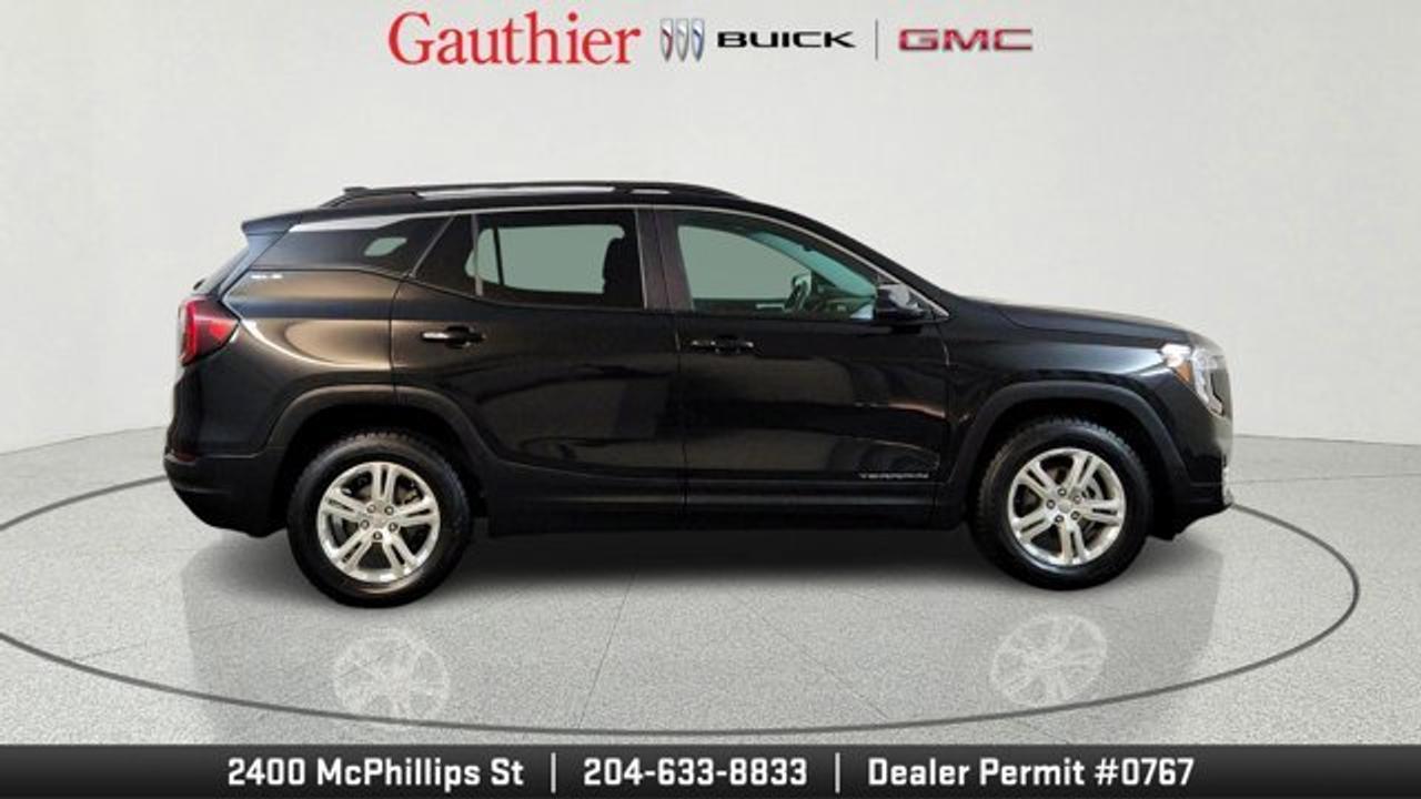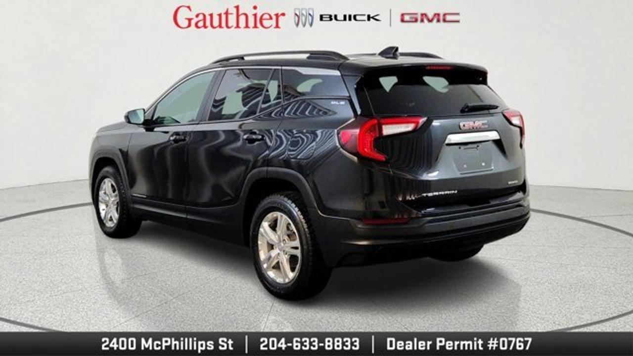 The 2024 GMC Terrain SLE is a compact SUV powered by a 1.5-liter turbocharged four-cylinder engine producing 175 horsepower, paired with a smooth 9-speed automatic transmission and all-wheel drive. It comes well-equipped with standard features like a 7-inch touchscreen infotainment system, wireless Apple CarPlay and Android Auto, keyless entry and ignition, and a comfortable cloth interior with seating for five. Safety is a strong focus, with standard driver-assistance technologies such as lane-keeping assist, forward collision warning, automatic emergency braking, and a rearview camera.