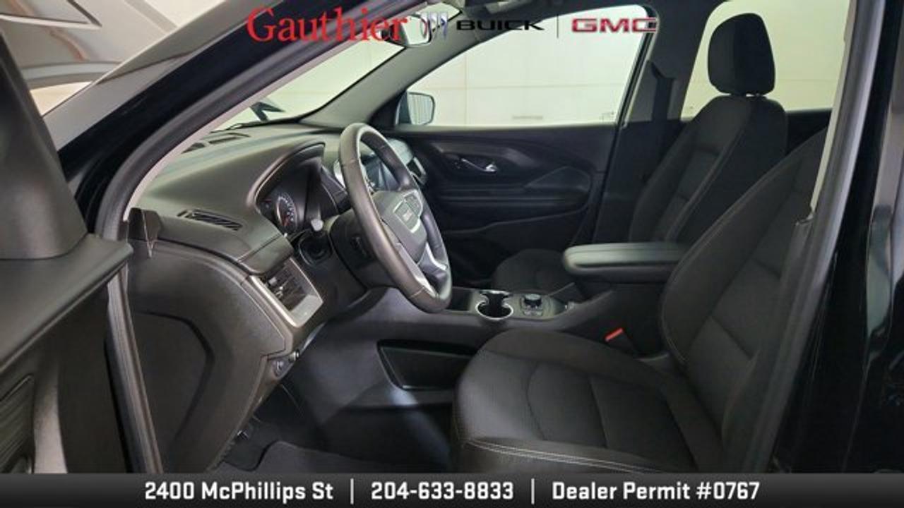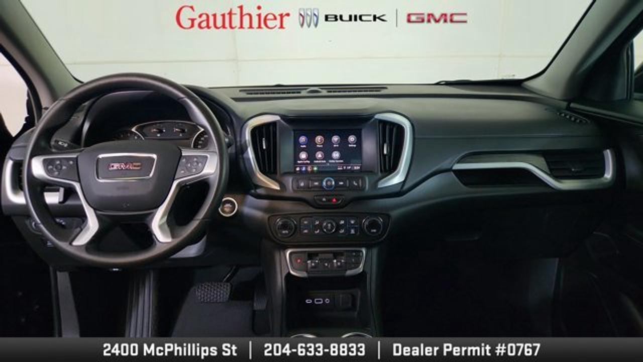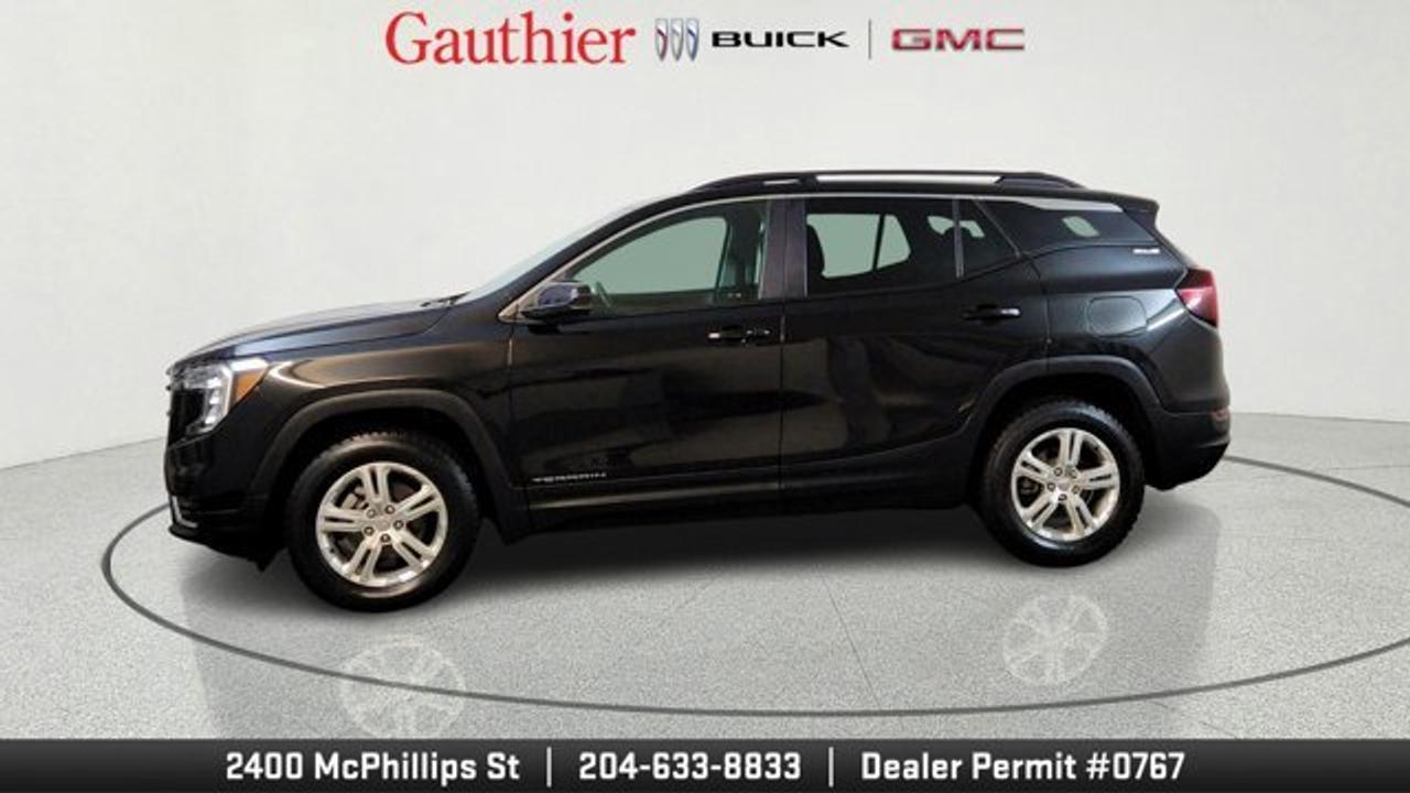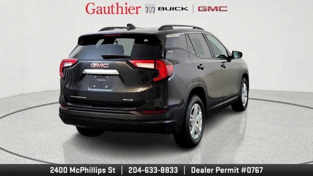 The 2024 GMC Terrain SLE is a compact SUV powered by a 1.5-liter turbocharged four-cylinder engine producing 175 horsepower, paired with a smooth 9-speed automatic transmission and all-wheel drive. It comes well-equipped with standard features like a 7-inch touchscreen infotainment system, wireless Apple CarPlay and Android Auto, keyless entry and ignition, and a comfortable cloth interior with seating for five. Safety is a strong focus, with standard driver-assistance technologies such as lane-keeping assist, forward collision warning, automatic emergency braking, and a rearview camera.